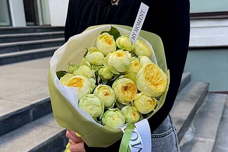 Жёлтые пионовидные розы в дизайнерской упаковке доставка