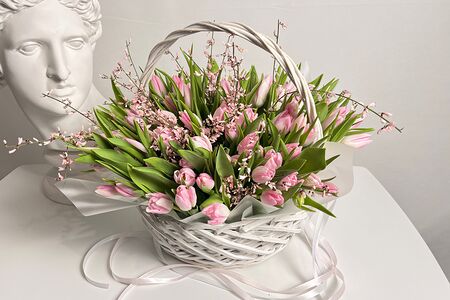 Тюльпан розовый 101 (шт.), гениста, корзина плетёная белая, оазис