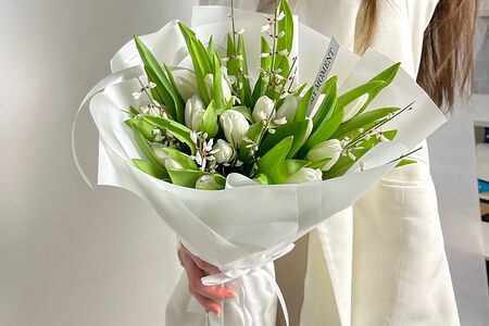 Букет из 25 белых тюльпанов с генистой в белой упаковке доставка