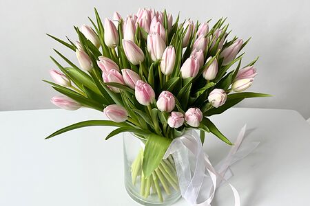Тюльпан розовый (51 шт.), ленты, ваза (стекло), пакет (крафт)