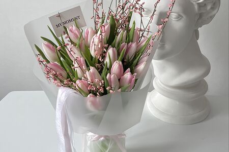 25 розовых тюльпанов с генистой в матовой упаковке доставка
