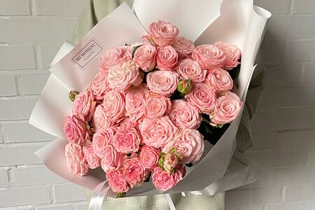 19 веток кустовых роз Бомбастик (с ароматом шиповника), упаковка дизайнерская (1 шт.), лента атласная (2 шт.), пакет для транспортировки (1 шт.)
