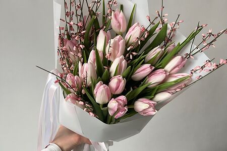 Букет из 25 розовых тюльпанов и генисты в белой упаковке доставка