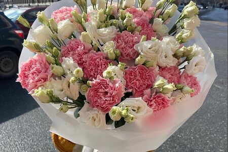 Эустома (10 шт.), диантус розовый: в зависимости от величины бутона (13-16 шт.), упаковка (1 шт.), лента атласная (2 шт.), пакет для транспортировки