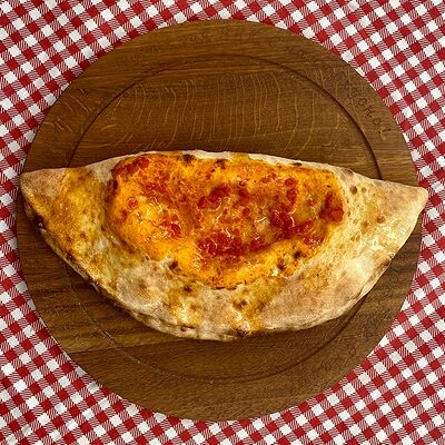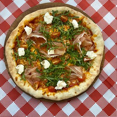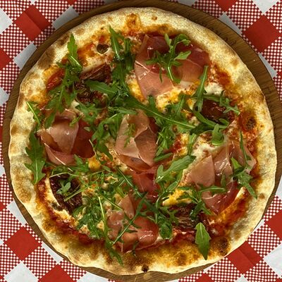 Томатный соус, сыр моцарелла, прошутто крудо, сыр рикотта, помидоры черри, руккола, оливковое масло. Бортик пиццы наполнен сыром рикотта (33 см)