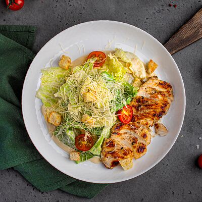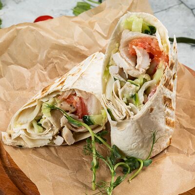 Лаваш, сочное куриное филе, салат айсберг, томаты, огурцы, домашний соус цезарь