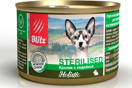 Blitz Sterilised консервы для стерилизованных кошек (суфле) Кролик и индейка, 200 г. доставка