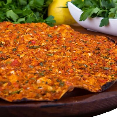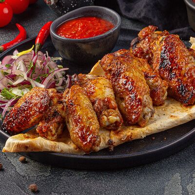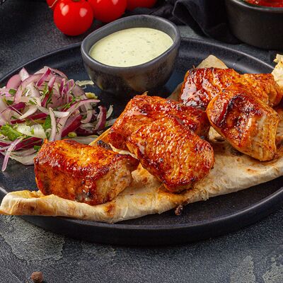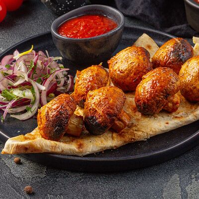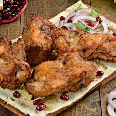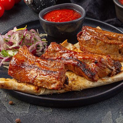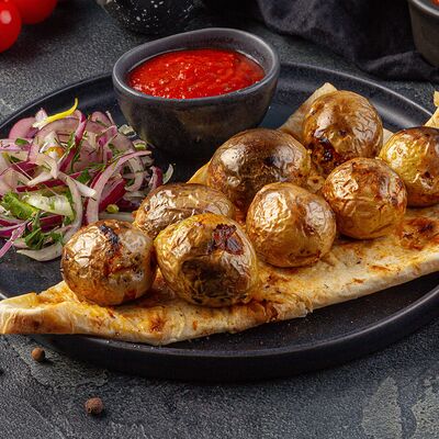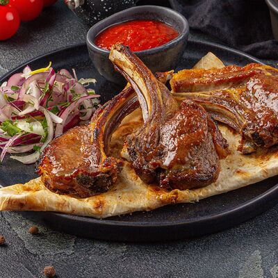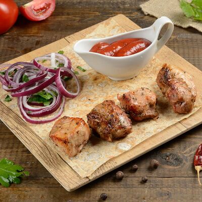 Подается с лавашом, луком и укропом