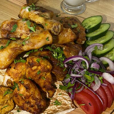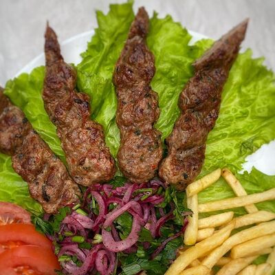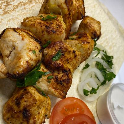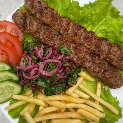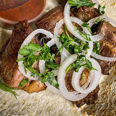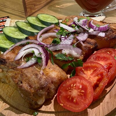 Ароматный шашлык из cвинoй шейки, приготовленный на углях. Подается с лавашом, фирменным соусом и тонкими нежными кольцами из красного лука