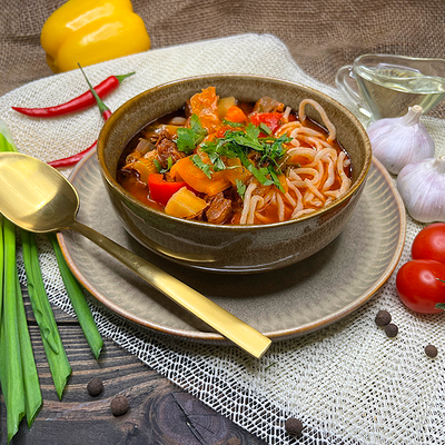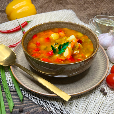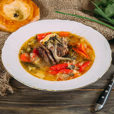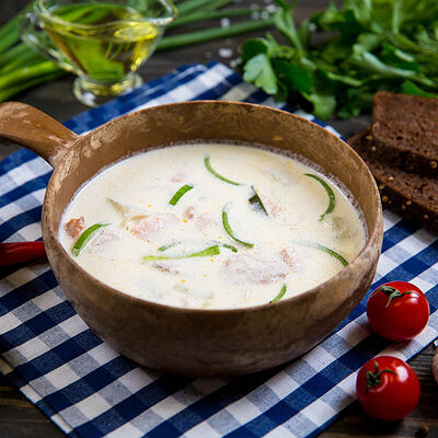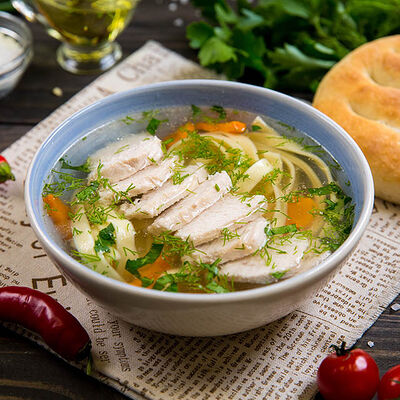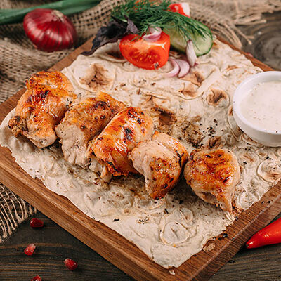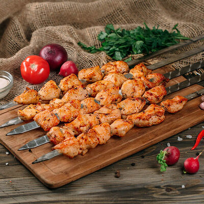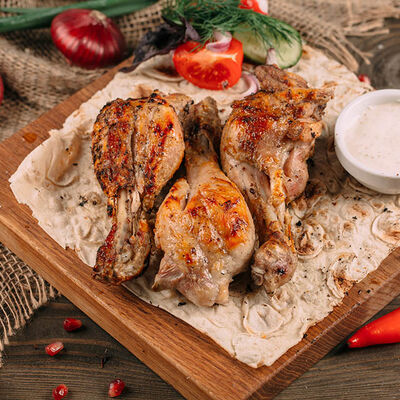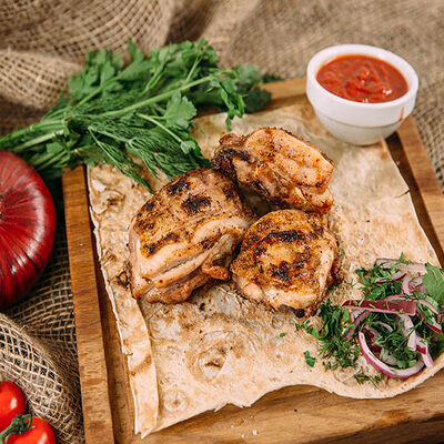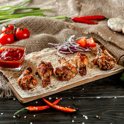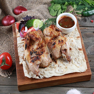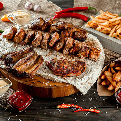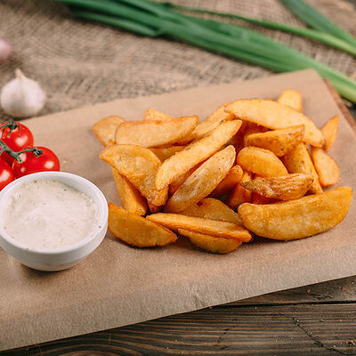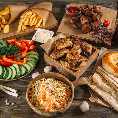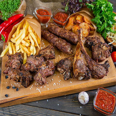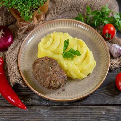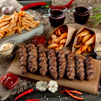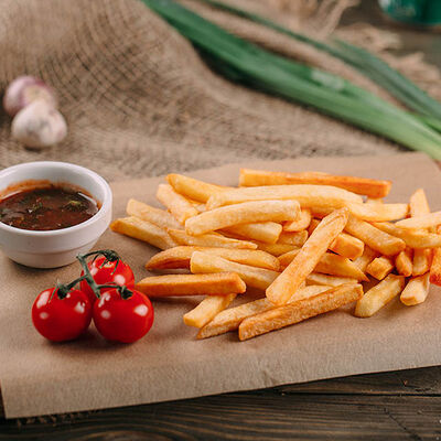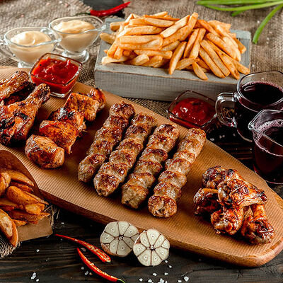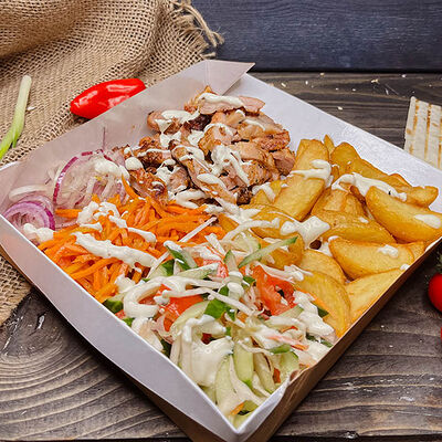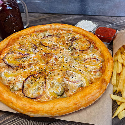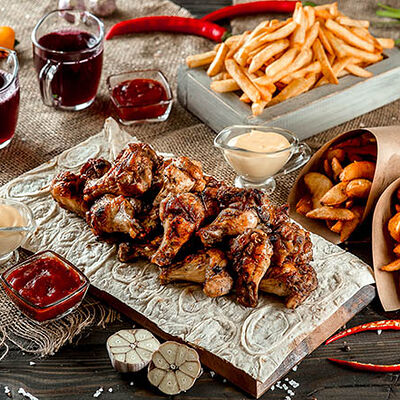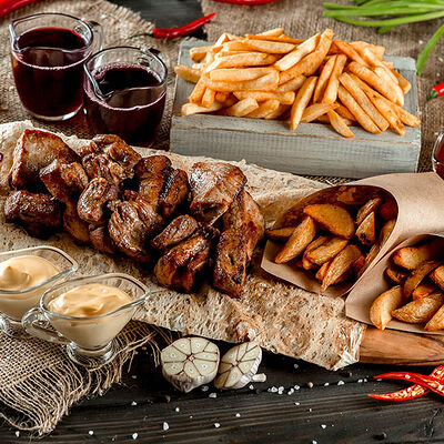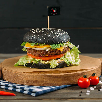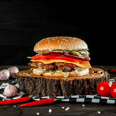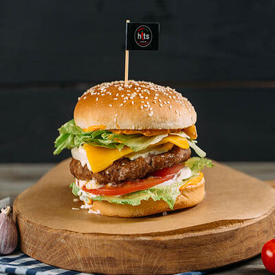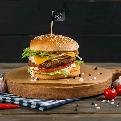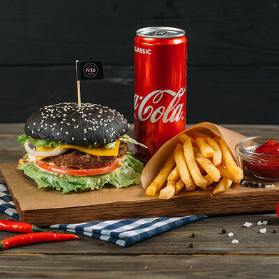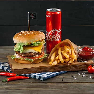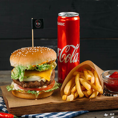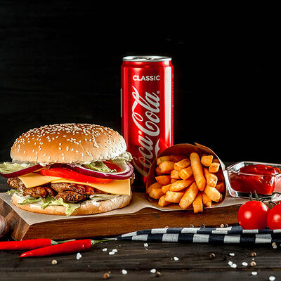 Набор, включающий в себя мощный, сочный и сытный фирменный бургер с нежнейшей куриной котлетой в дуэте с кусочком изысканного сыра чеддер, картофель фри, томатный соус и кока-колу (0.33l)
