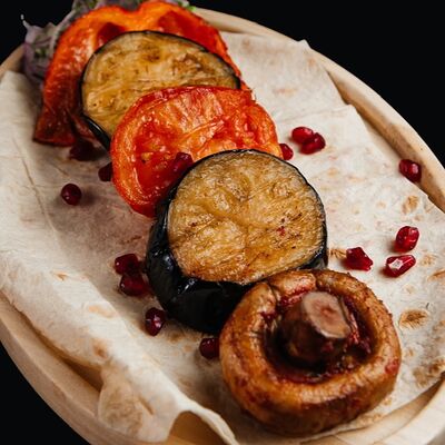 Болгарский перец, грибы, баклажан, помидор, лаваш