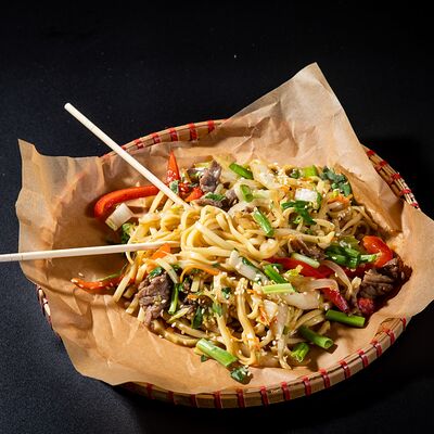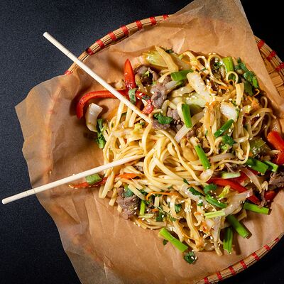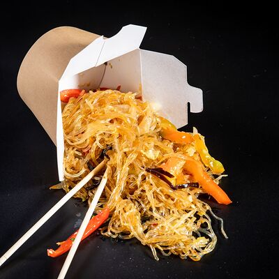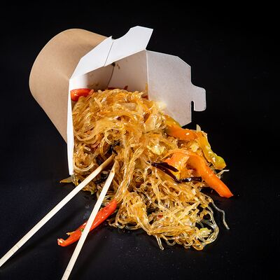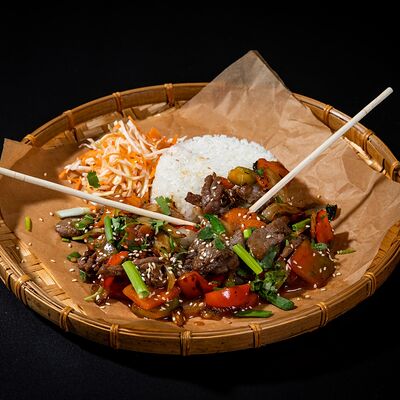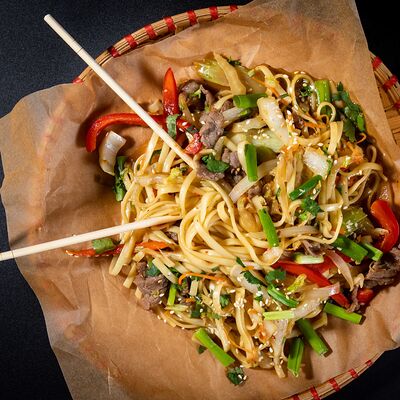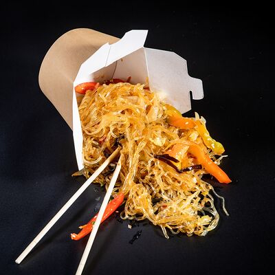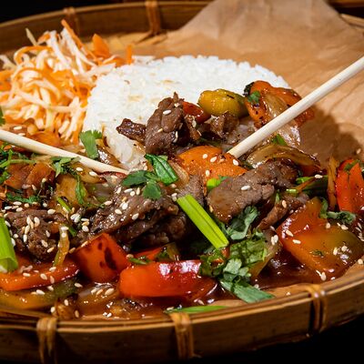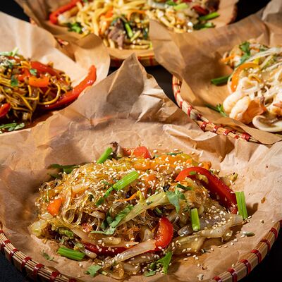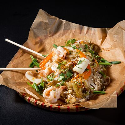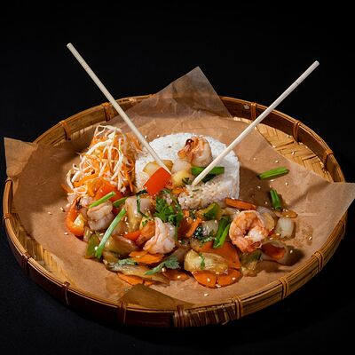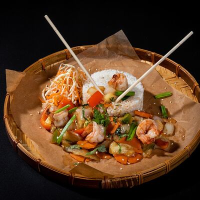 Жареный рис, овощи, креветки, кальмары