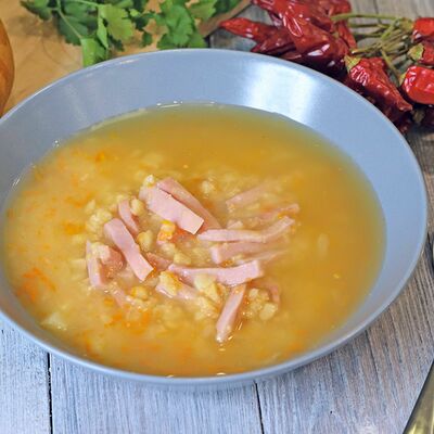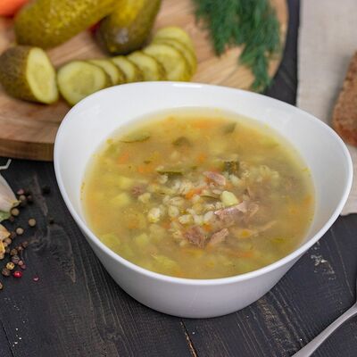 Бульон куриный, лук, морковь, картофель, говядина, огурцы консервированные, крупа перловая, специи