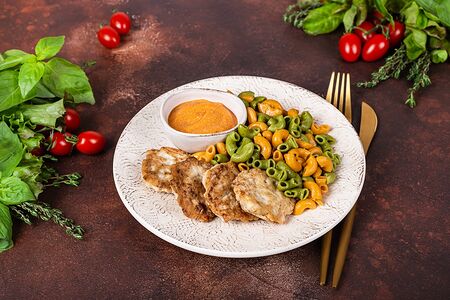 Маленькие ломтики рубленной куриной грудки в яйце, а на гарнир яркие макарошки из твердых сортов пшеницы дурум с полезным шпинатом и спелыми томатами. Вкусное и веселое блюдо для любимых гурманов, уже готовое, в ресторанной подаче, нужно просто разогреть.