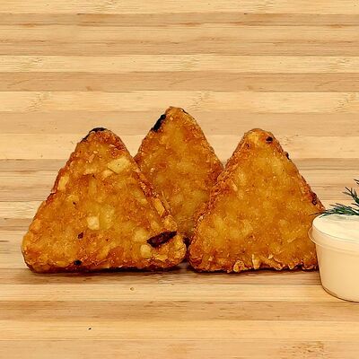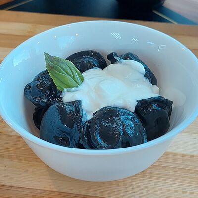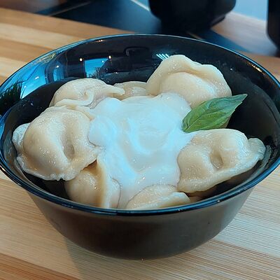 Фарш (говядина, бульон говяжий, лук репчатый, мясо цыпленка-бройлера, зелень петушки и укропа, паприка зеленая, перец черный молотый), тесто (мука пшеничная высшего сорта, вода питьевая, соль пищевая, масло подсолнечное рафинированное дезодорированное, меланж яичный) (10 шт.). Подаются со сметаной 20% (25 г)