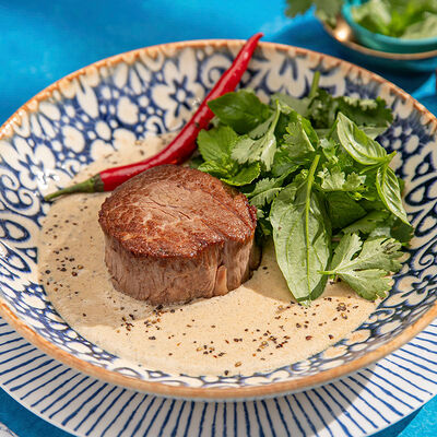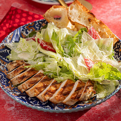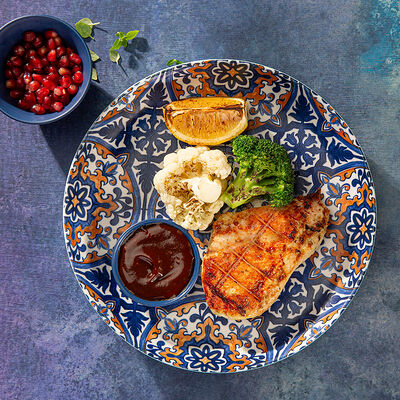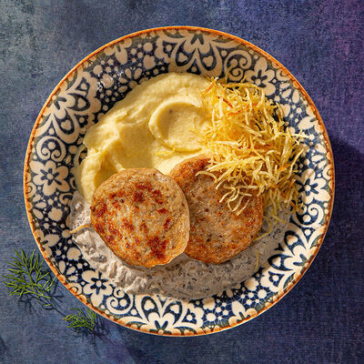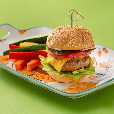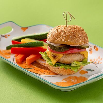 Куриный бургер компактного размера с гарнировкой из ярких овощей
