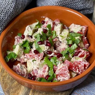 Мясо, картофель, корнишоны, морковь, консервированный горошек, яйца, майонез, соль, перец, зелень