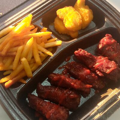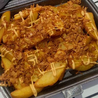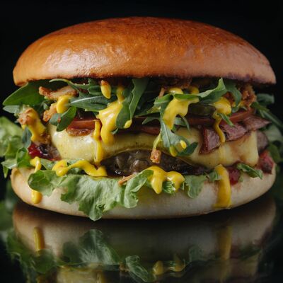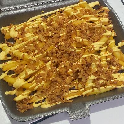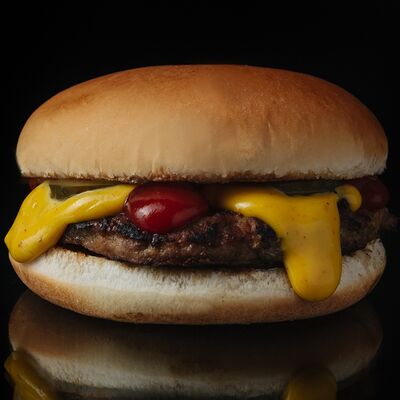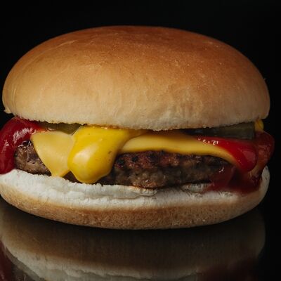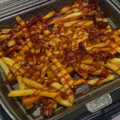 Кетчуп, горчица, бекон, говядина, сыр чеддер, картофель фри