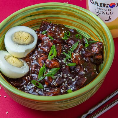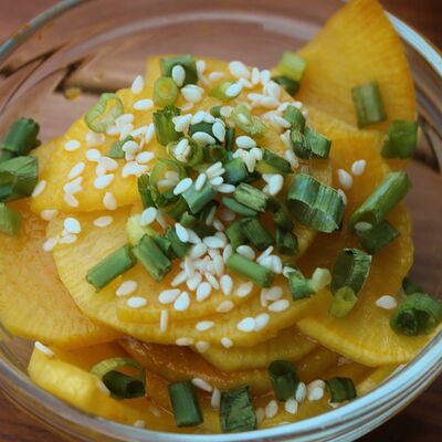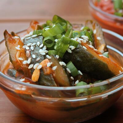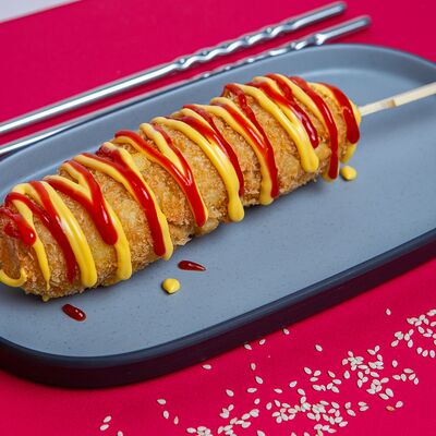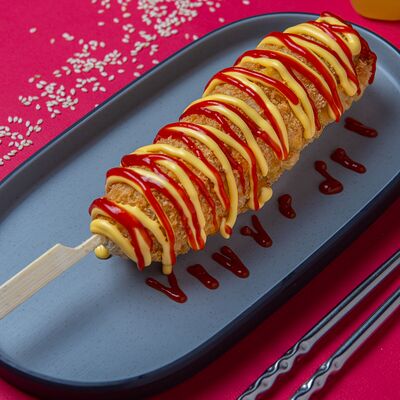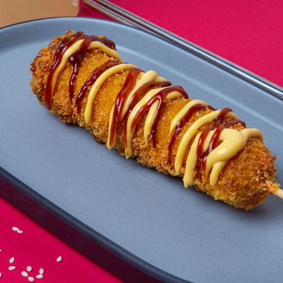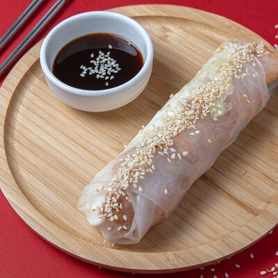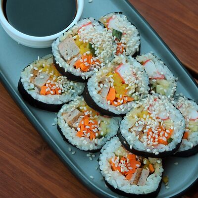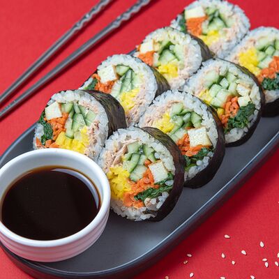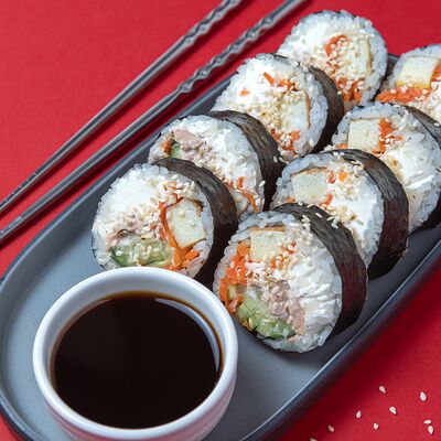 Корейский ролл с консервированным тунцом, майонезом, маринованным дайконом, шпинатом, морковью, огурцом и омлетом, в который входят яйца и специи (8 шт.)