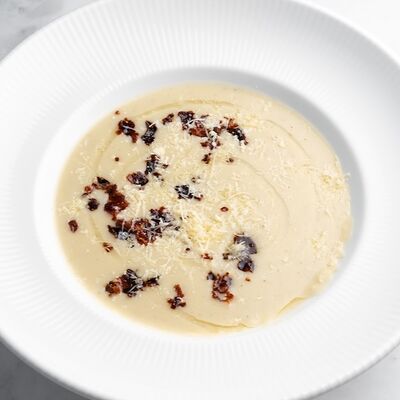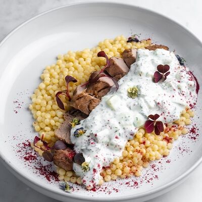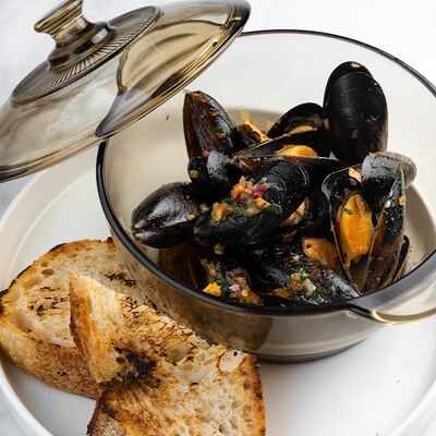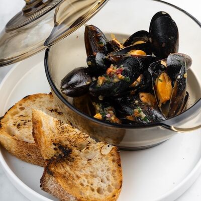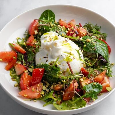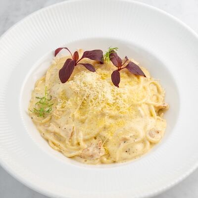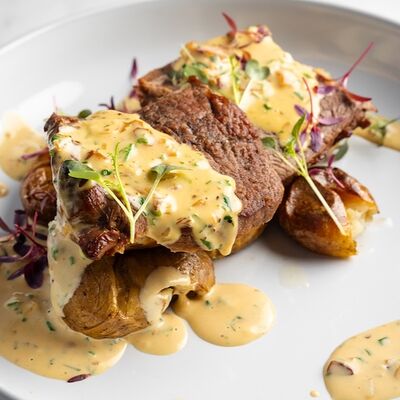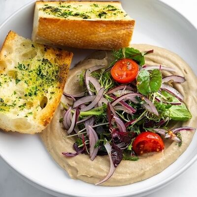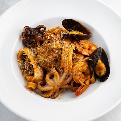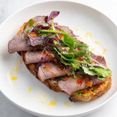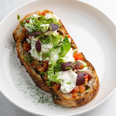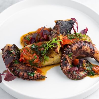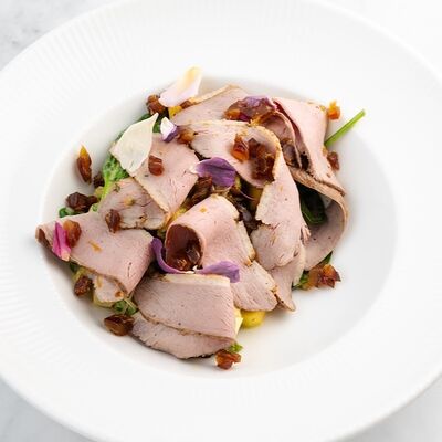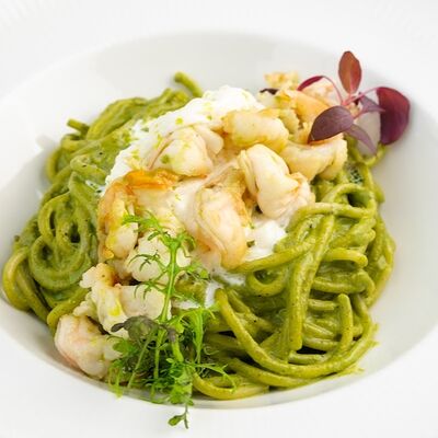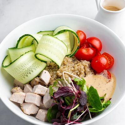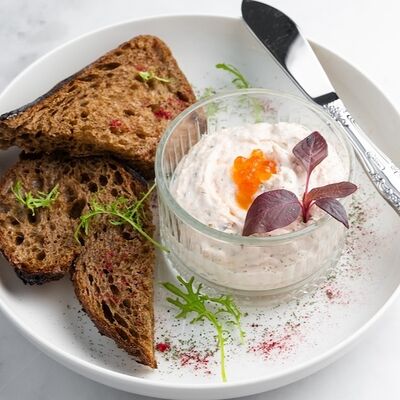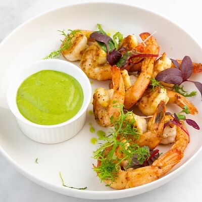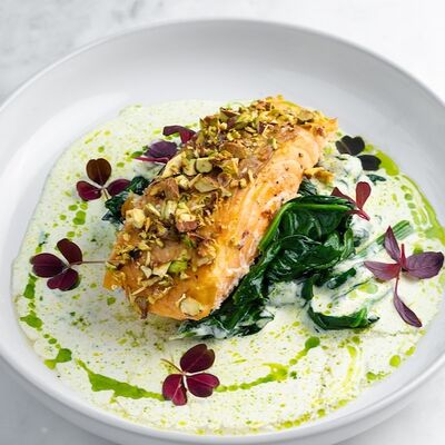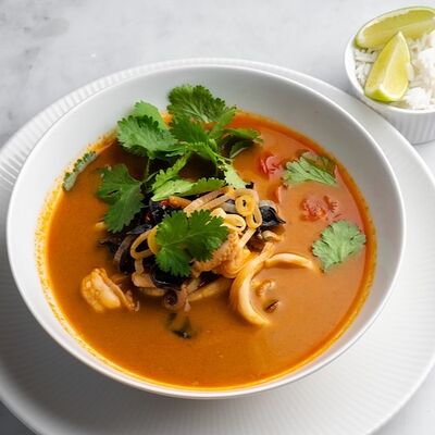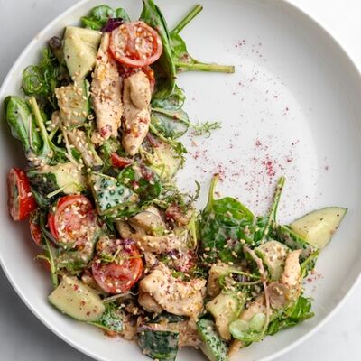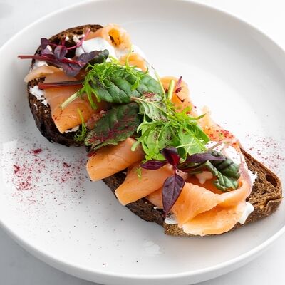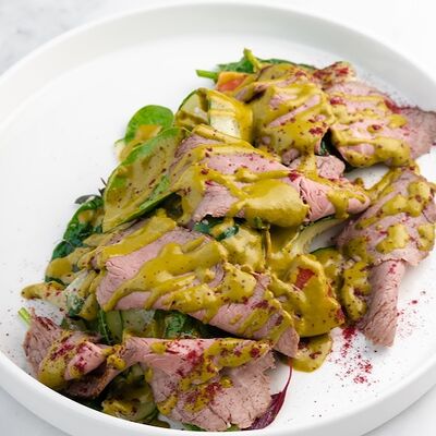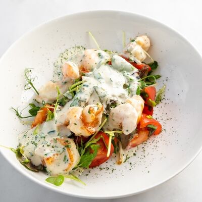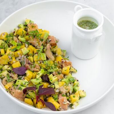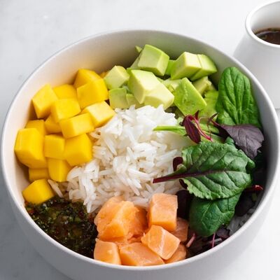 Манго, авокадо, слабосолёный лосось, оливковое масло и фирменный соус на основе кокосового молока, пасты Том-ям и сока лайма
