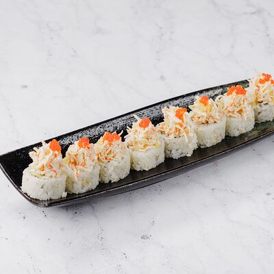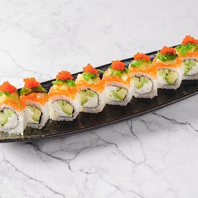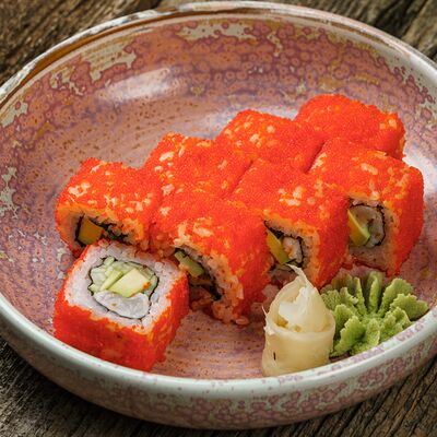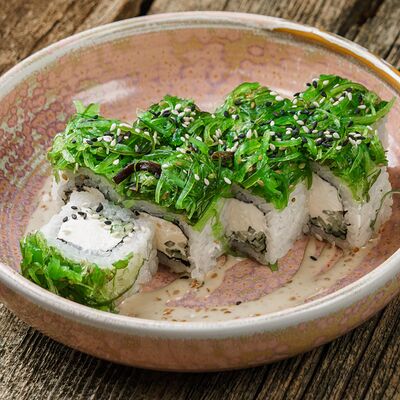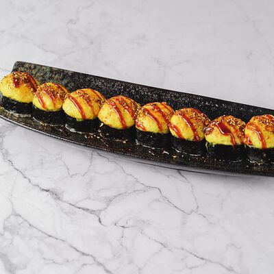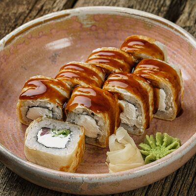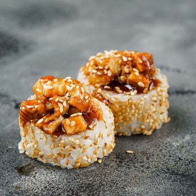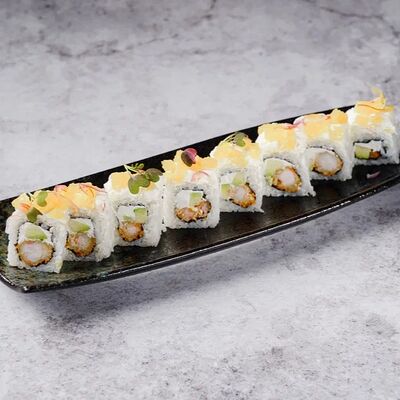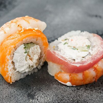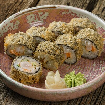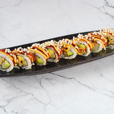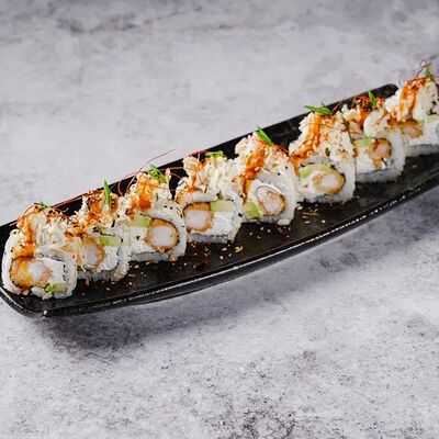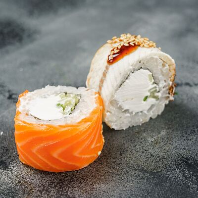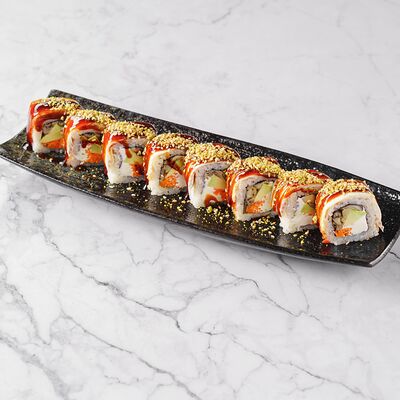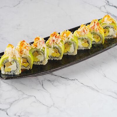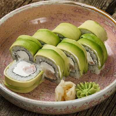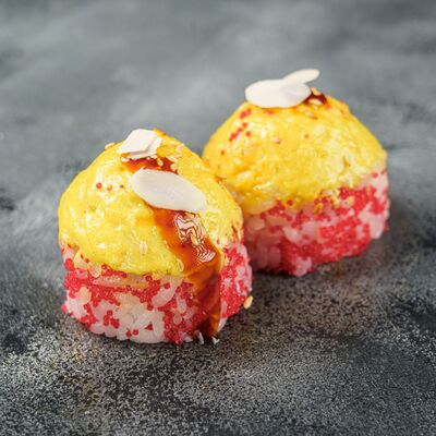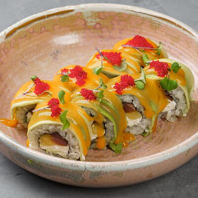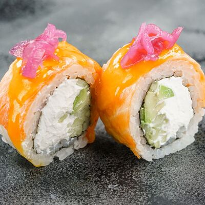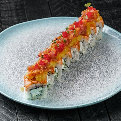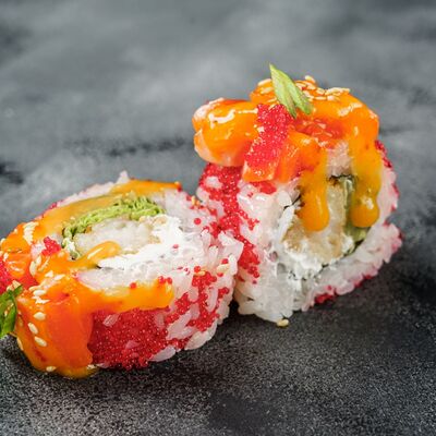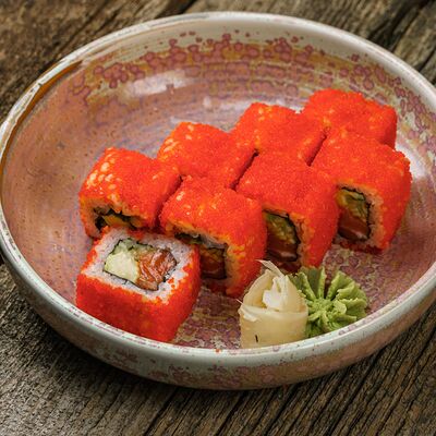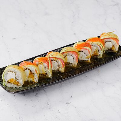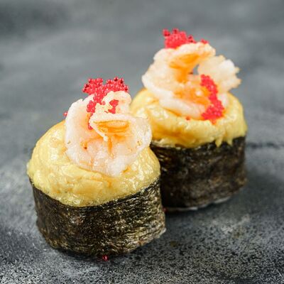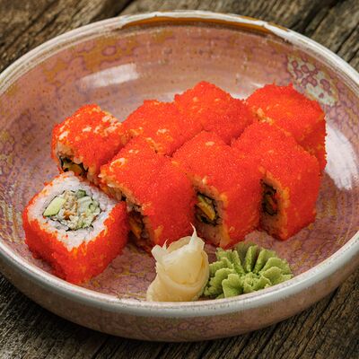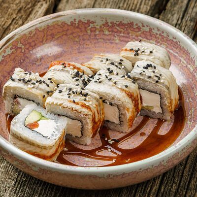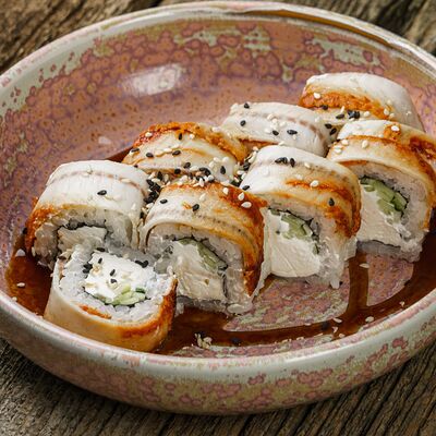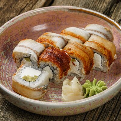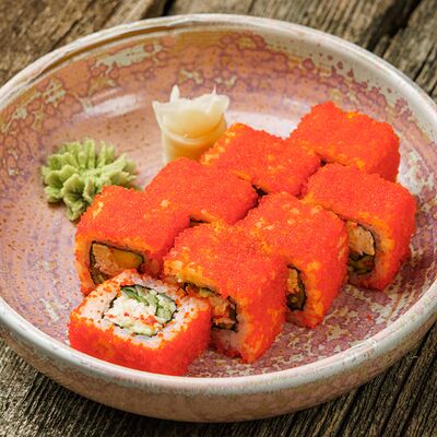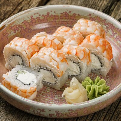 Креветка, сливочный сыр, огурец, омлет (яйца, молоко, соль), соус с угрём, такуан, унаги, зеленый лук, фурикаке, рис, нори Уважаемые клиенты, обращаем ваше внимание на то, что наборы приборов и специй - платные! Один бесплатный набор идёт за каждые 600р. Заказа!