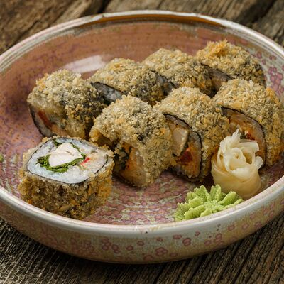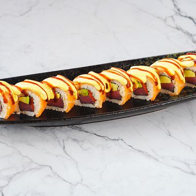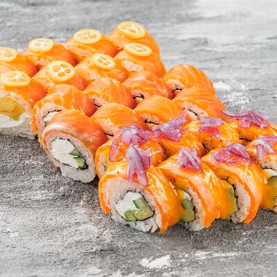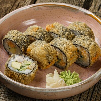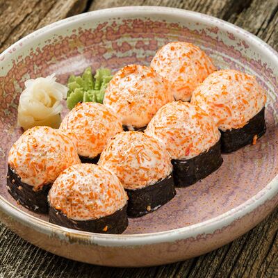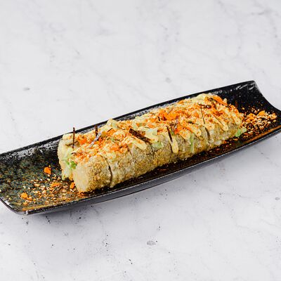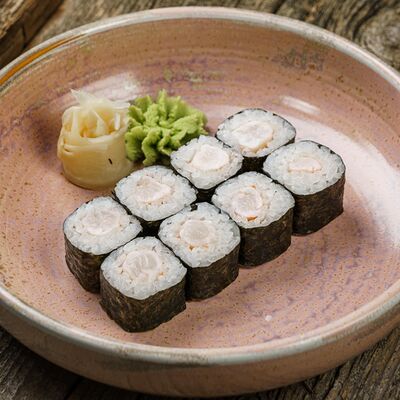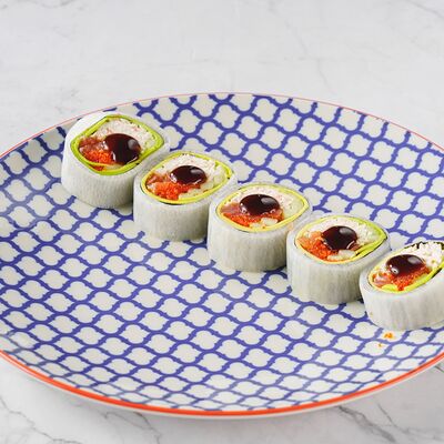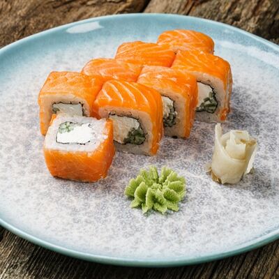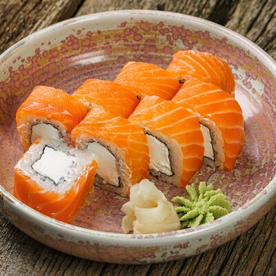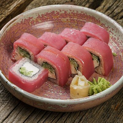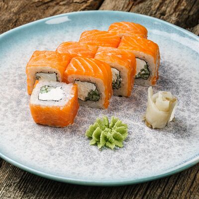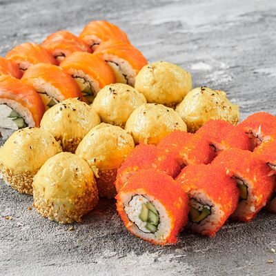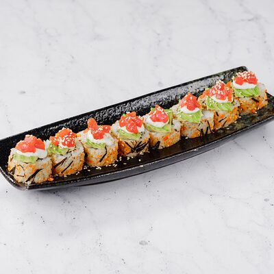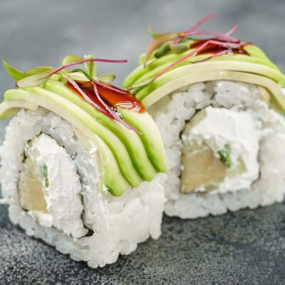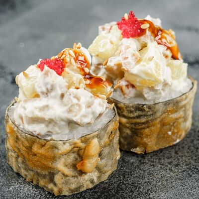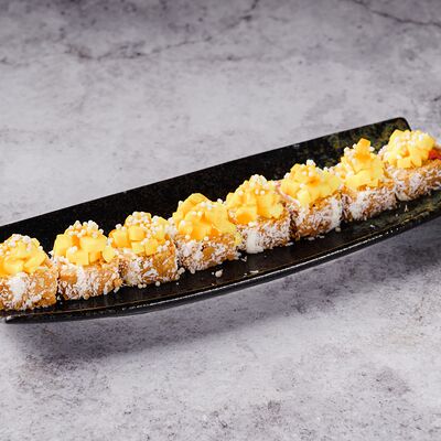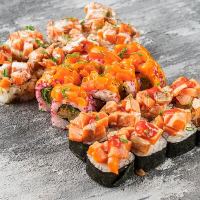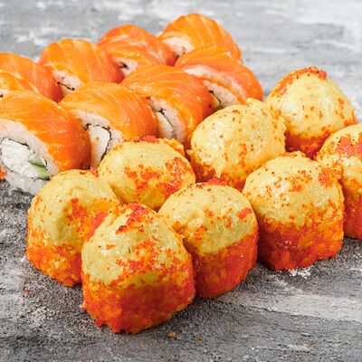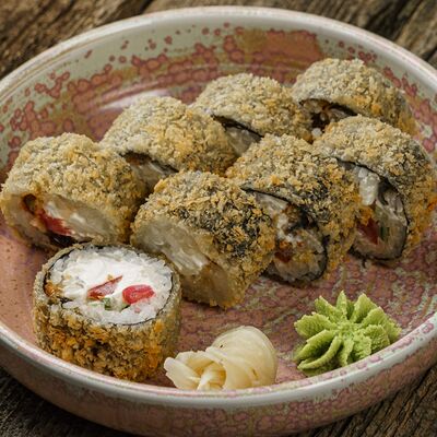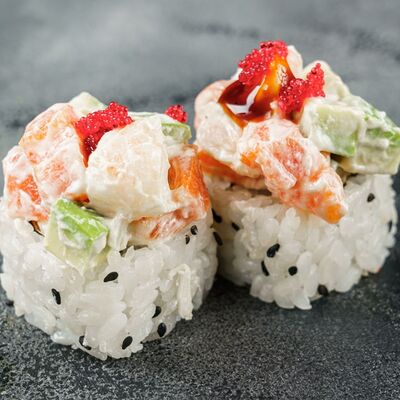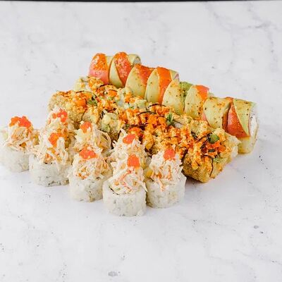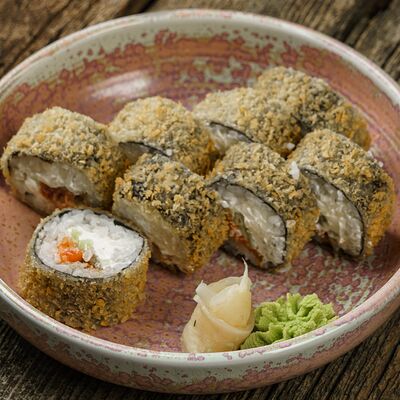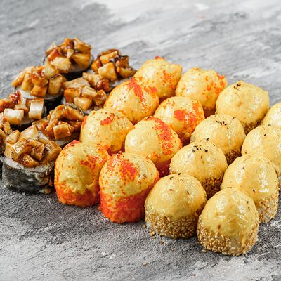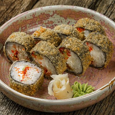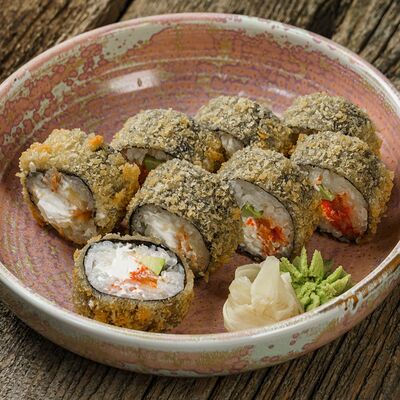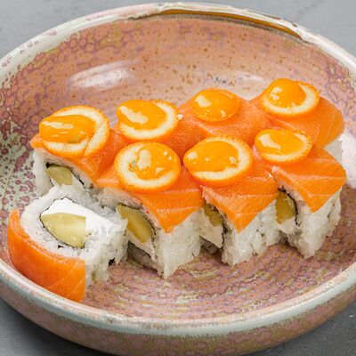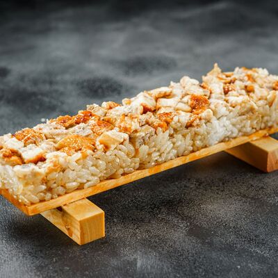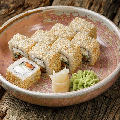 Креветка, сливочный сыр, огурец, омлет (яйца, молоко, соль), соус с угрём, такуан, унаги, зеленый лук, фурикаке, рис, нори Уважаемые клиенты, обращаем ваше внимание на то, что наборы приборов и специй - платные! Один бесплатный набор идёт за каждые 600р. Заказа!