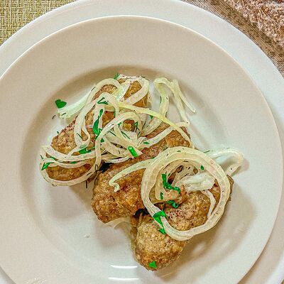 Фарш говяжий, яйцо, хлеб, лук, специи, масло подсолнечное, панировочные сухари
