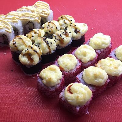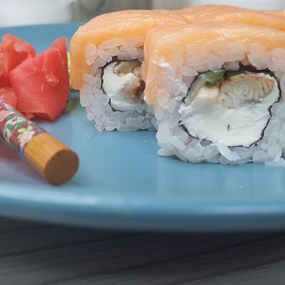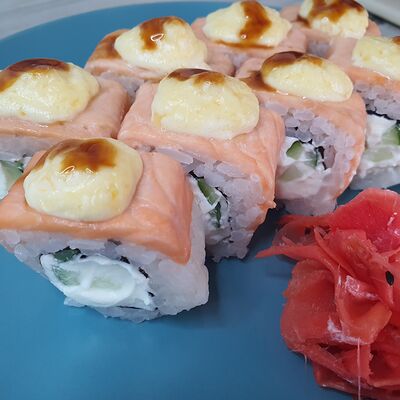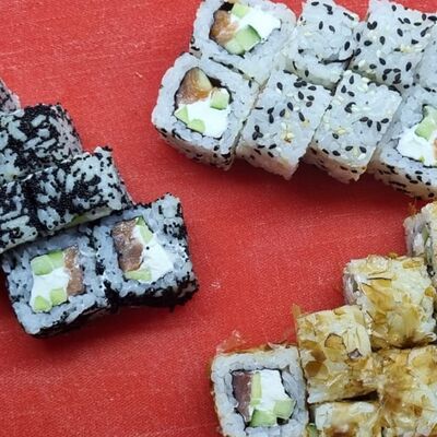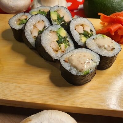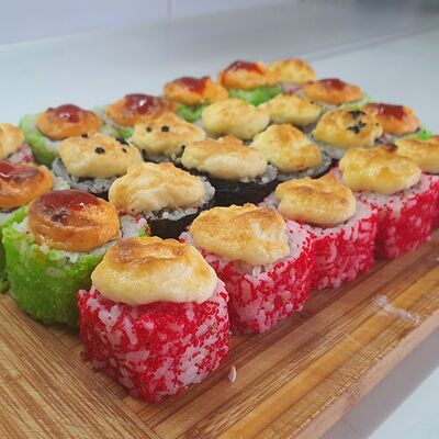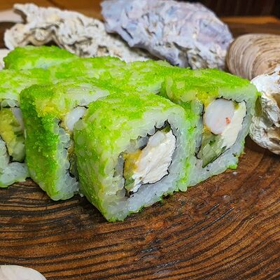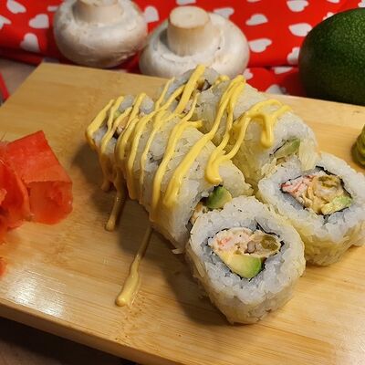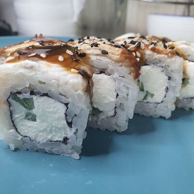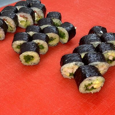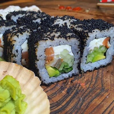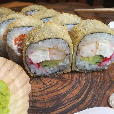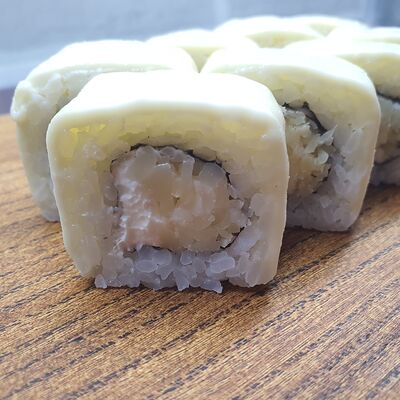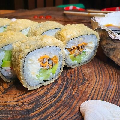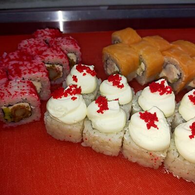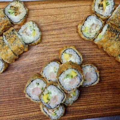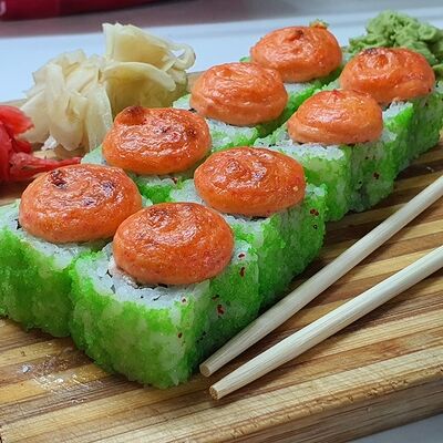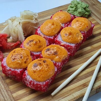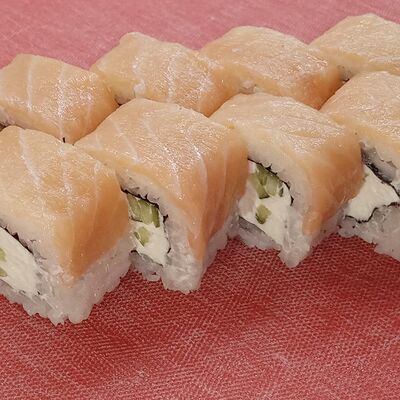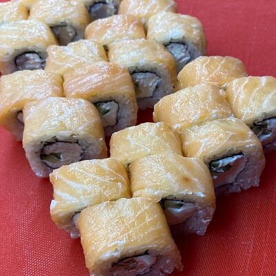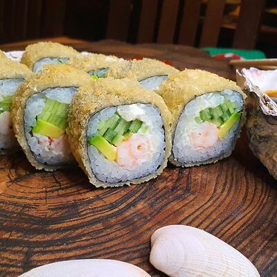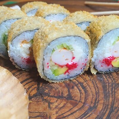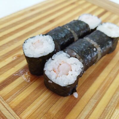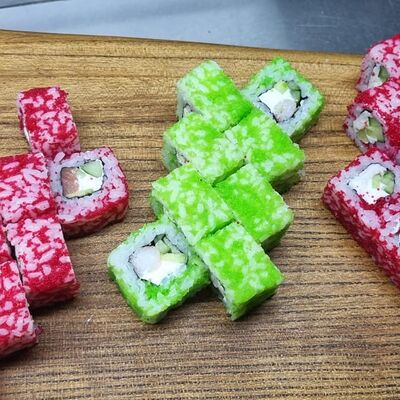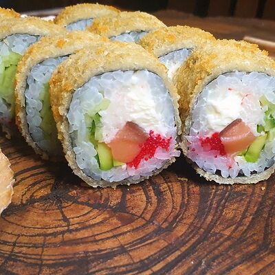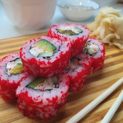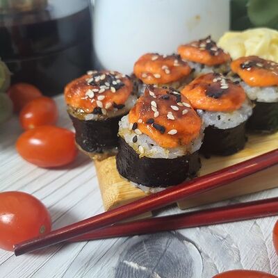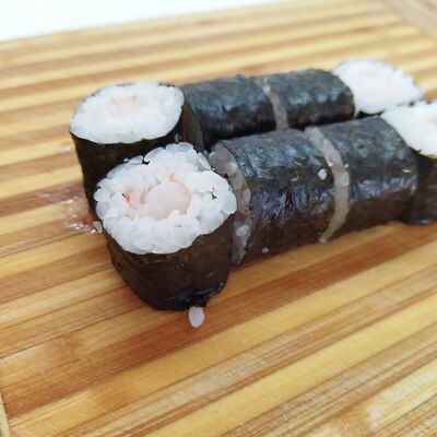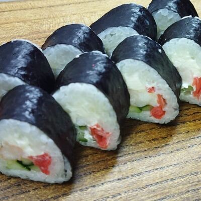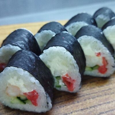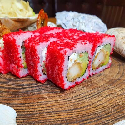 Тигровые креветки, нори, огурец, красная масаго, сливочный сыр, рис