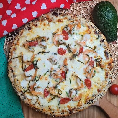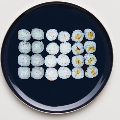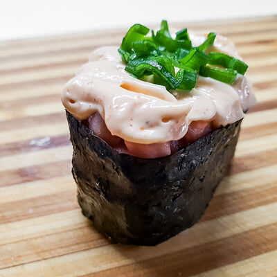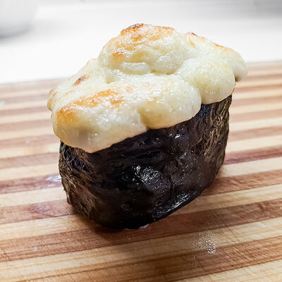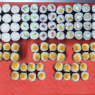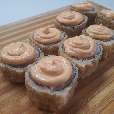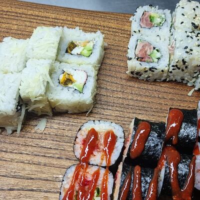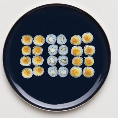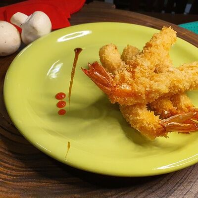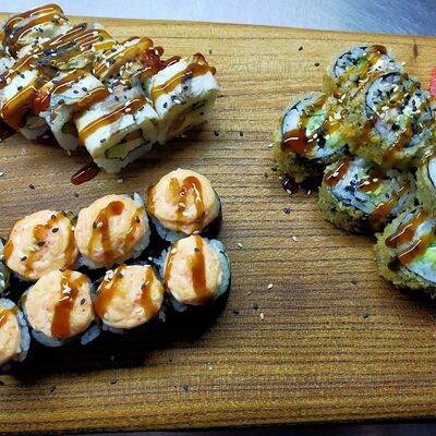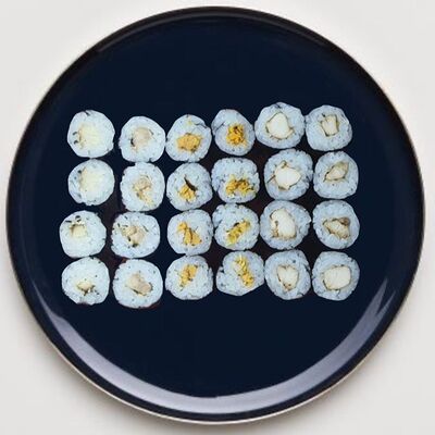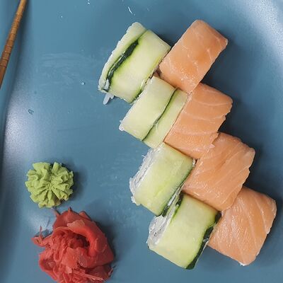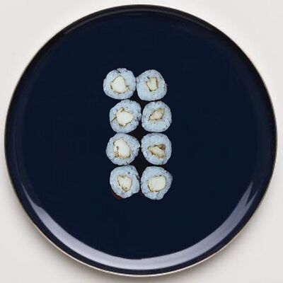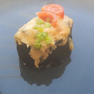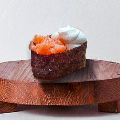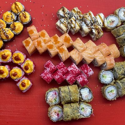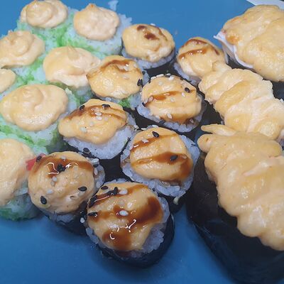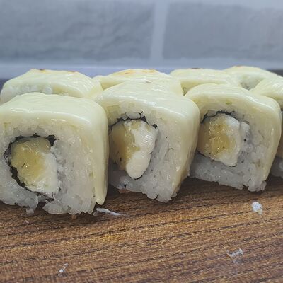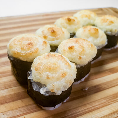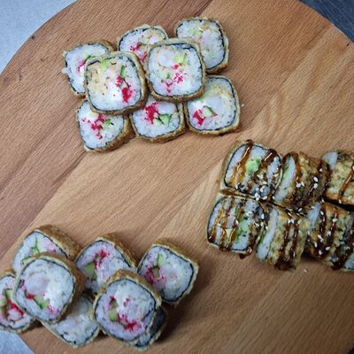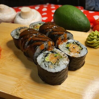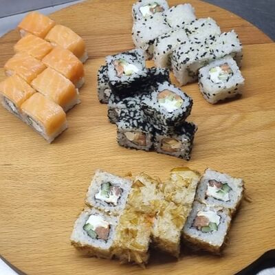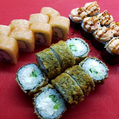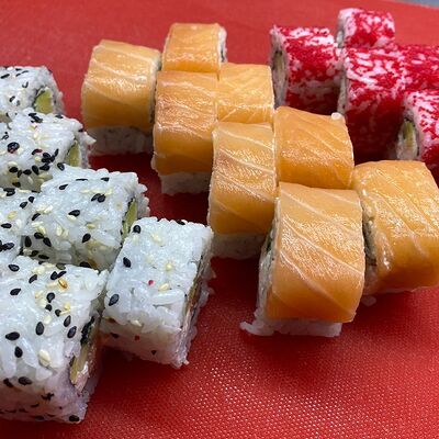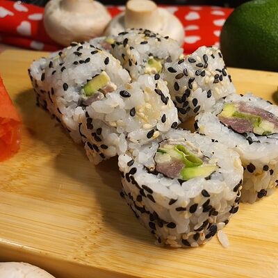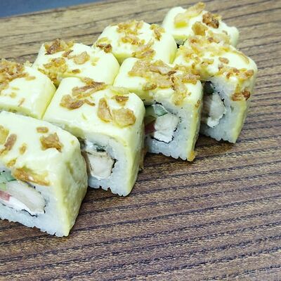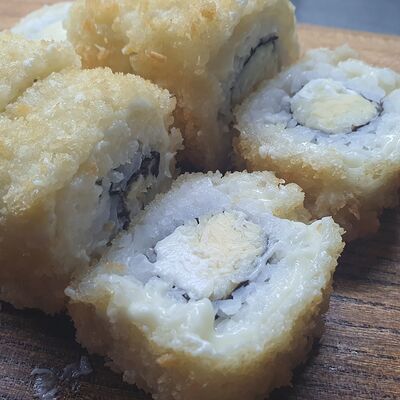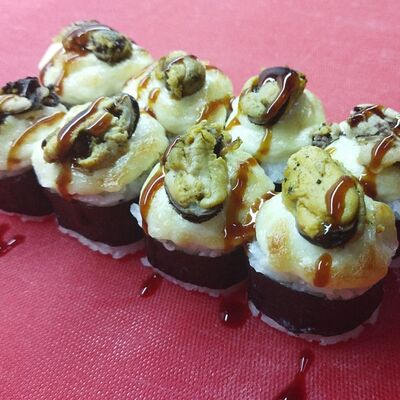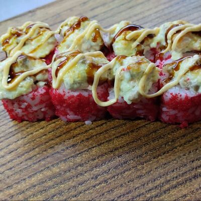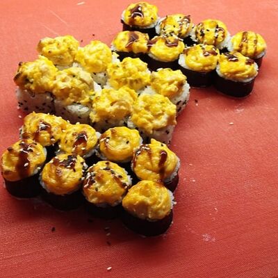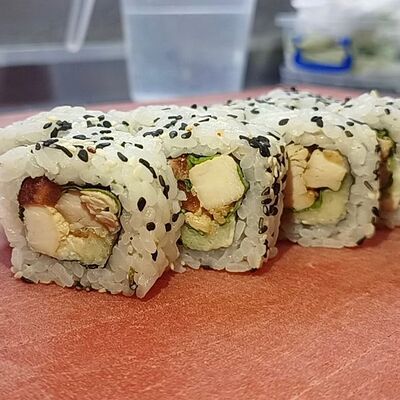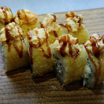 Тигровые креветки, нори, огурец, красная масаго, сливочный сыр, рис