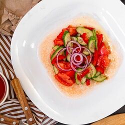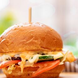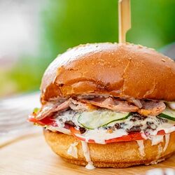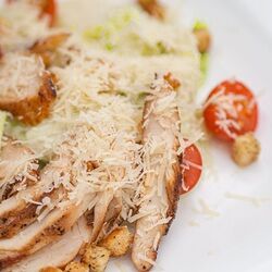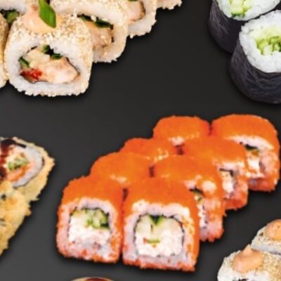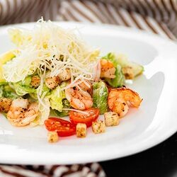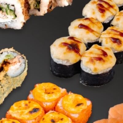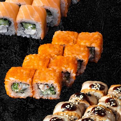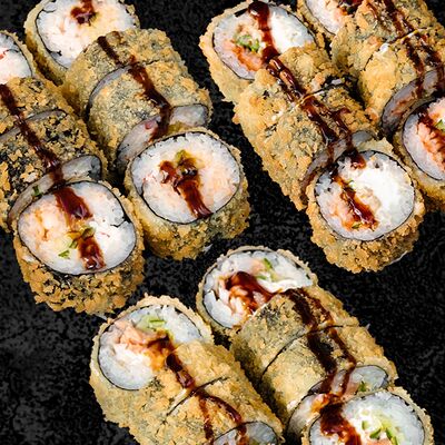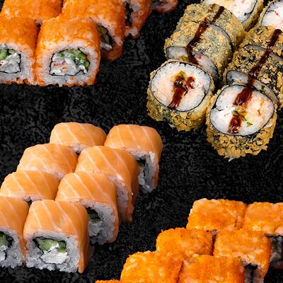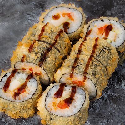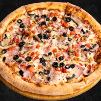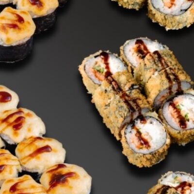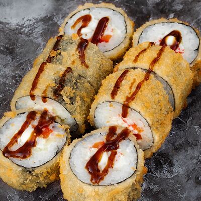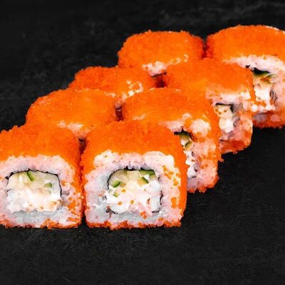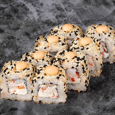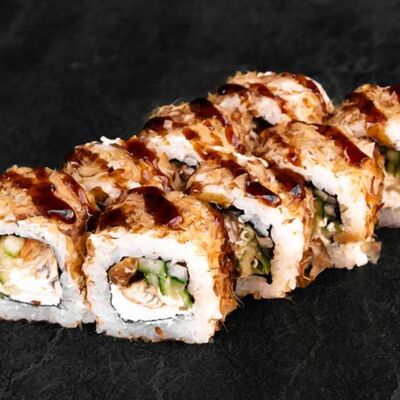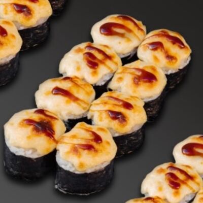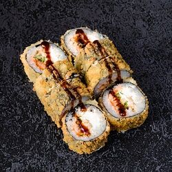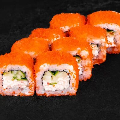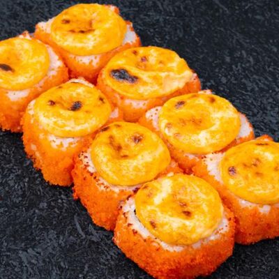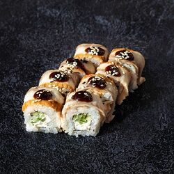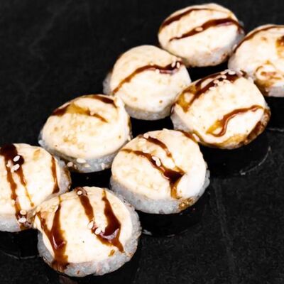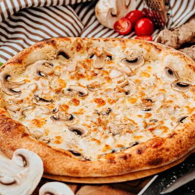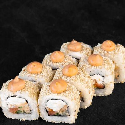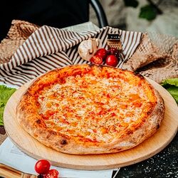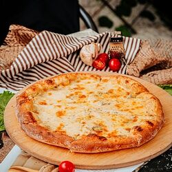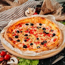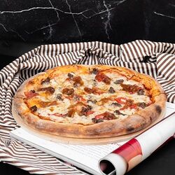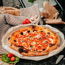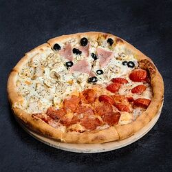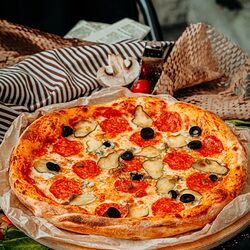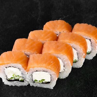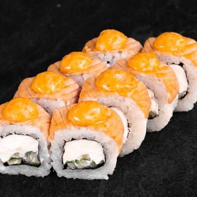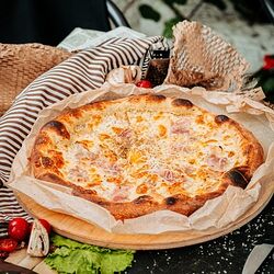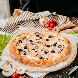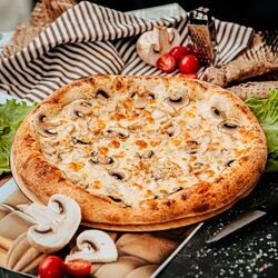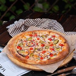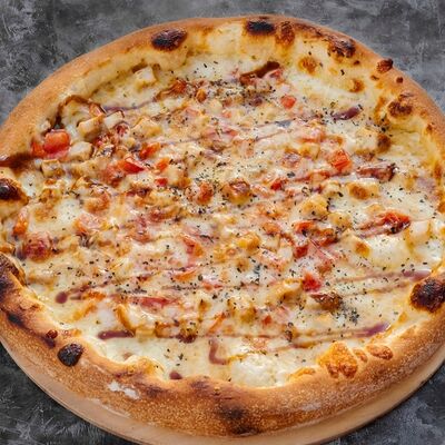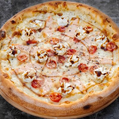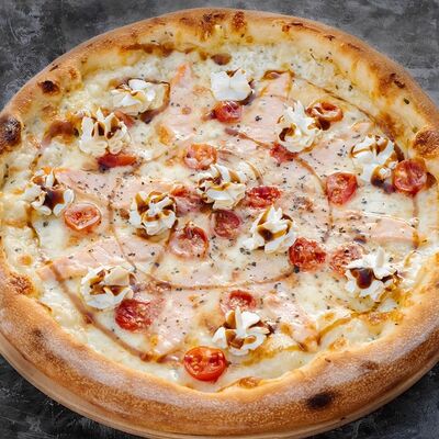 Тонкое тесто, белый соус, моцарелла, лосось, томаты черри, творожный сыр, соус терияки (30 см)