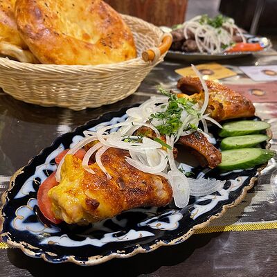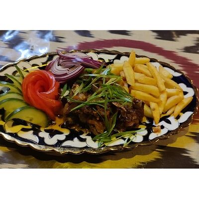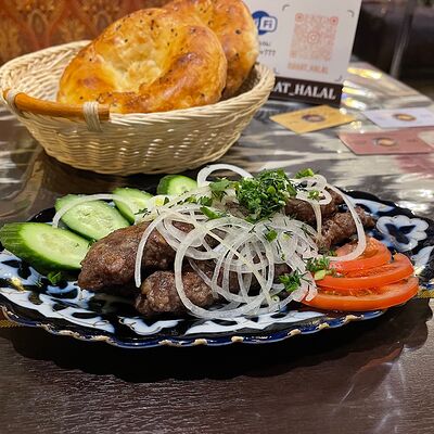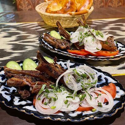 Рубленые бараньи рёбрышки халяль в специях, приготовленные в казане. Подаются с луком, свежей зеленью и картофелем фри