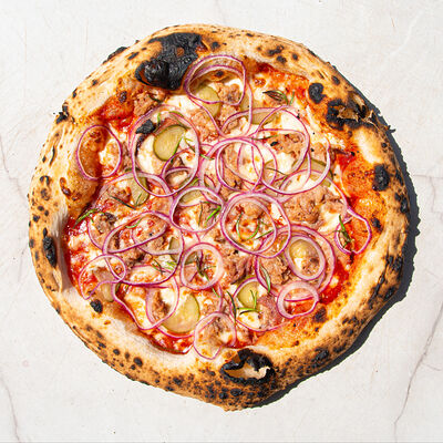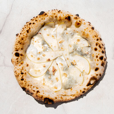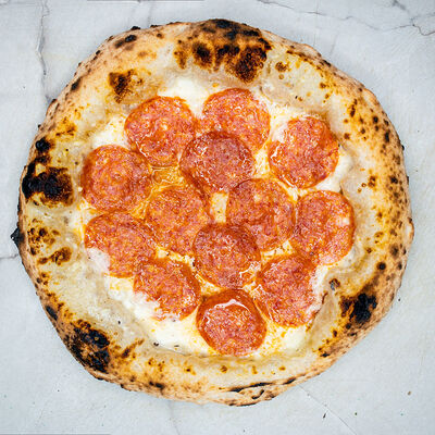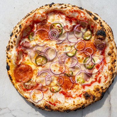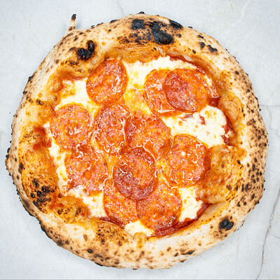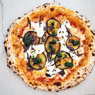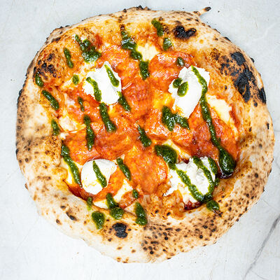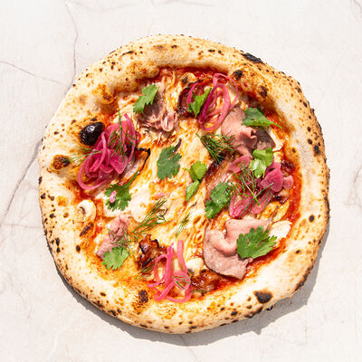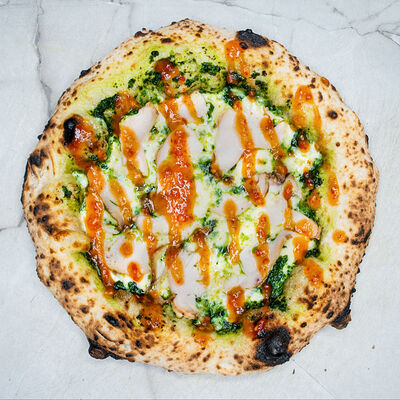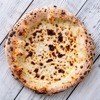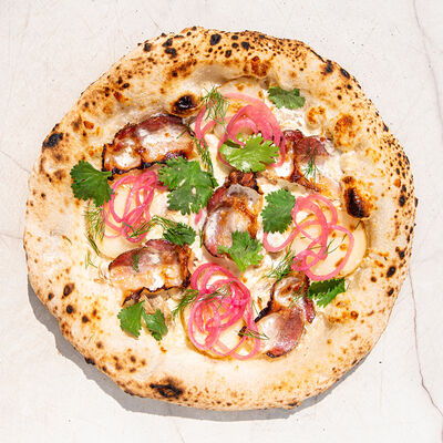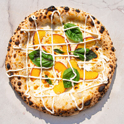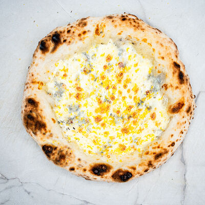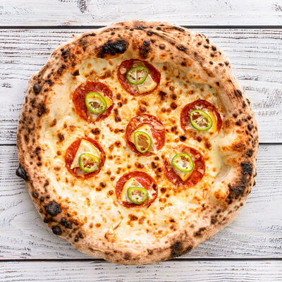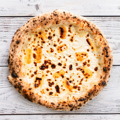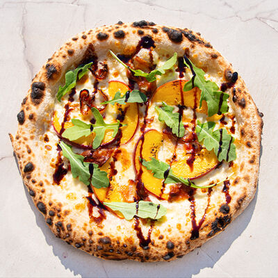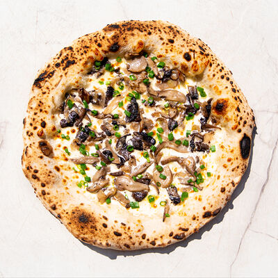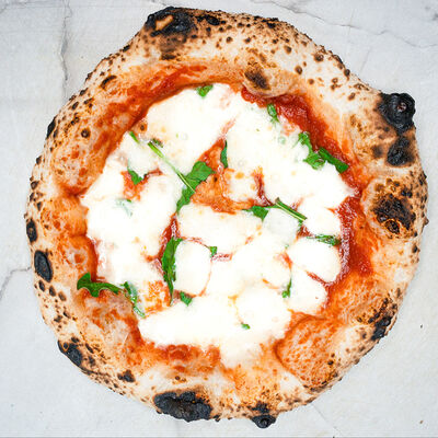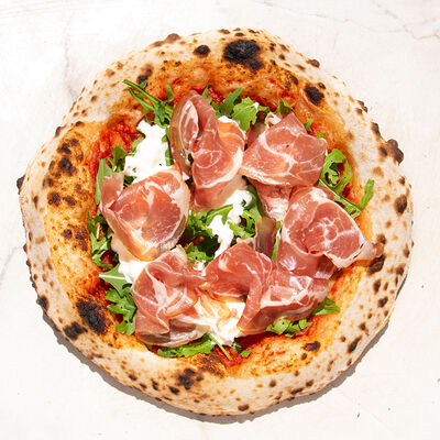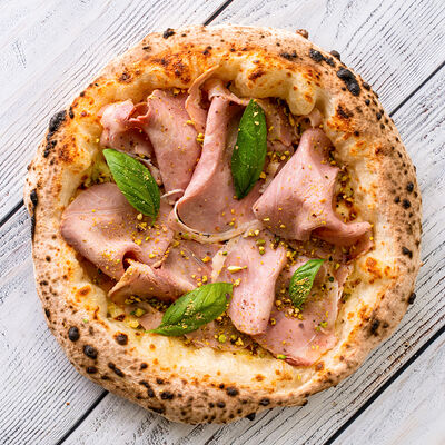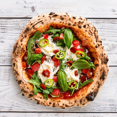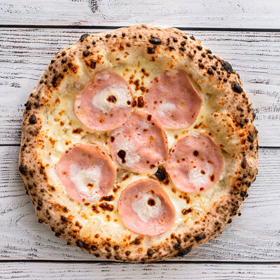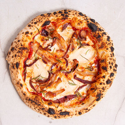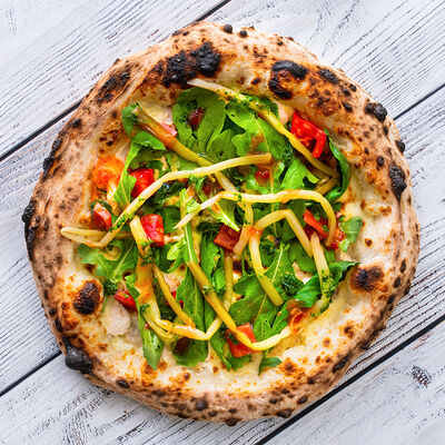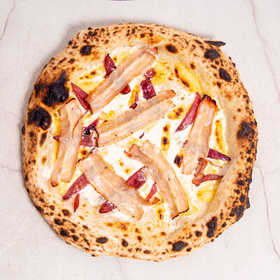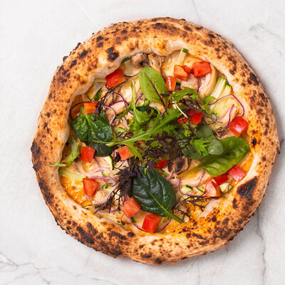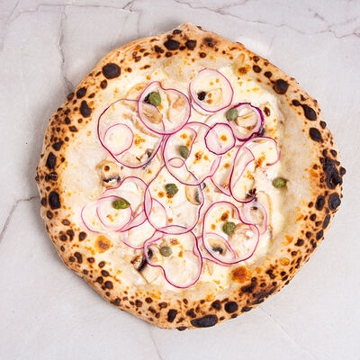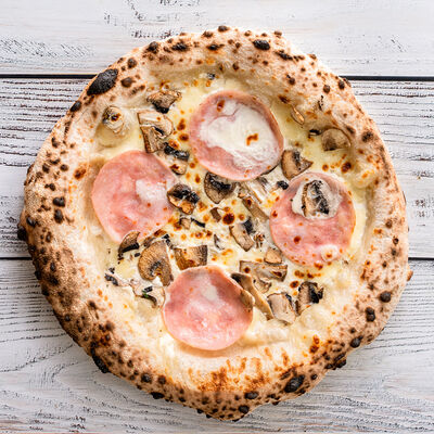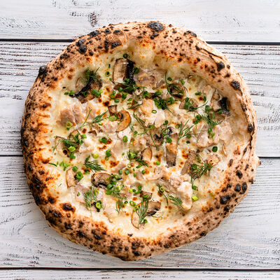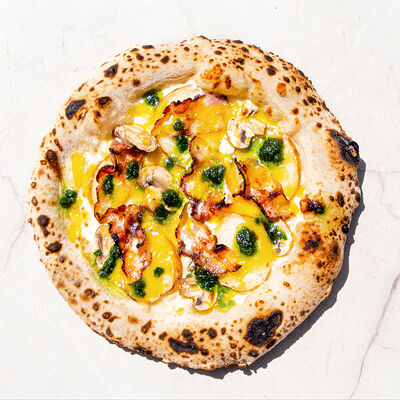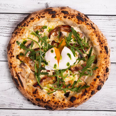 Тесто, сыр, сливки, бекон, шампиньоны, зеленое масло, руккола, яйцо пашот (22 см)