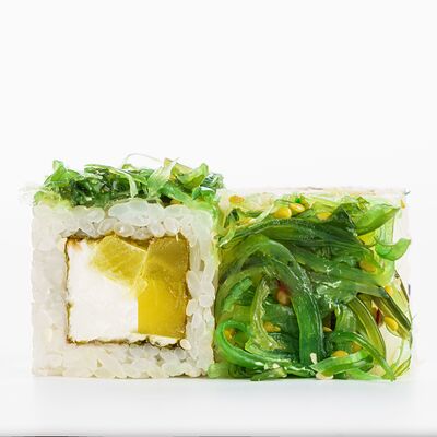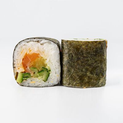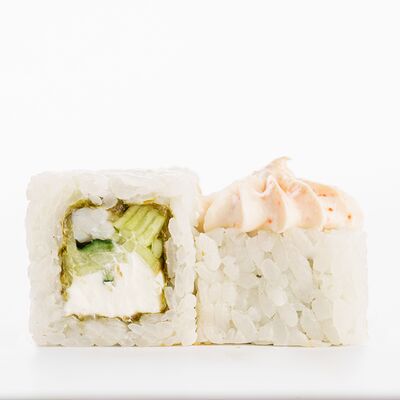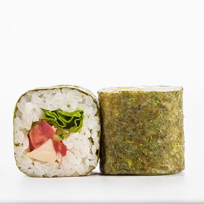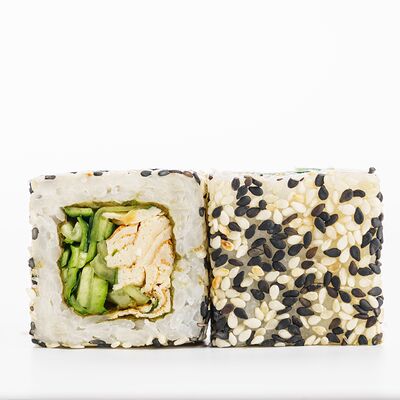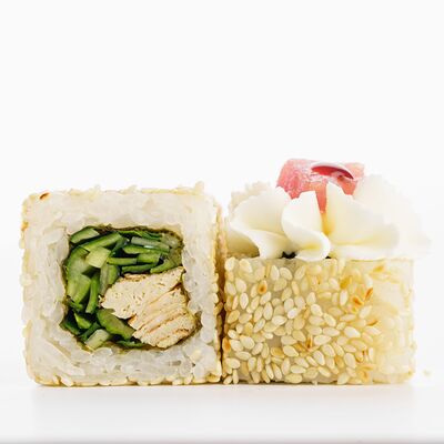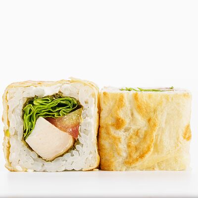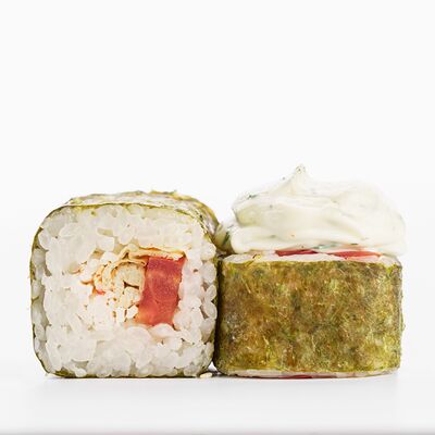 Рис, нори, копченое филе цыпленка, лист салата, помидор, сливочный сыр