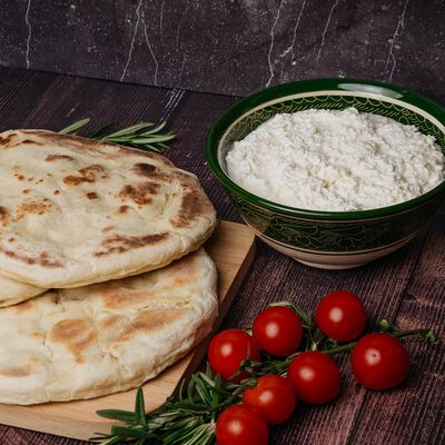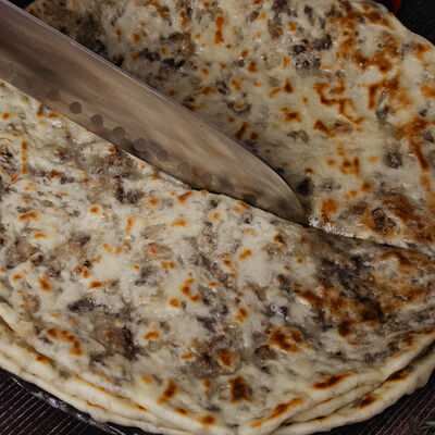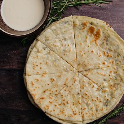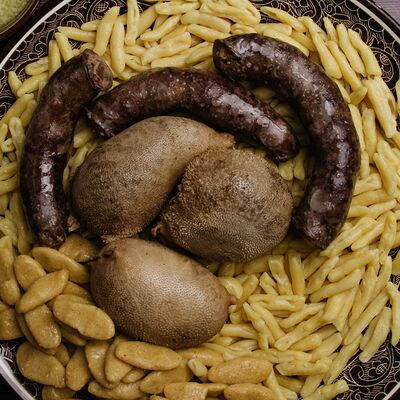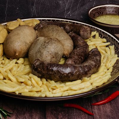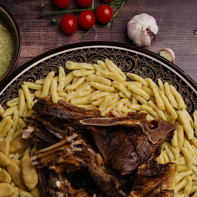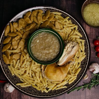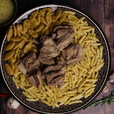 Сушеная в горах чечни конина, галушки из пшеничной и кукурузной муки, говяжий бульон, чесночный и луковый соуса