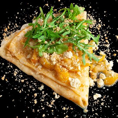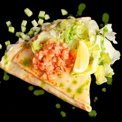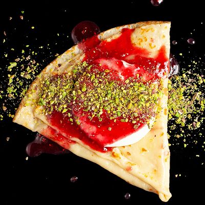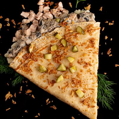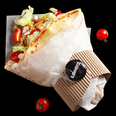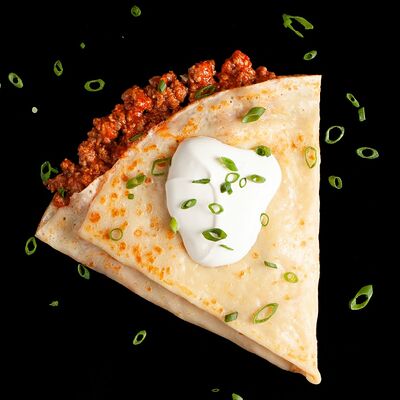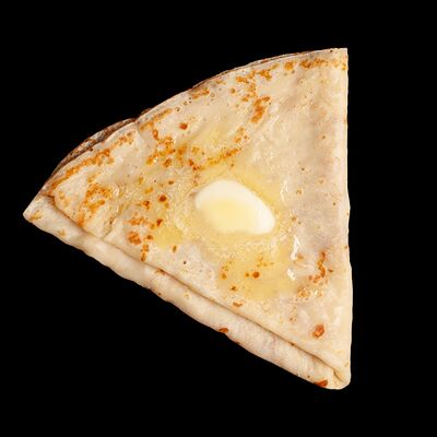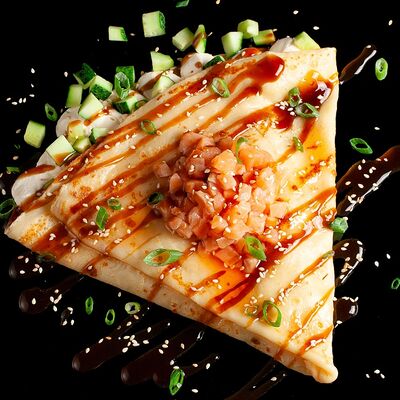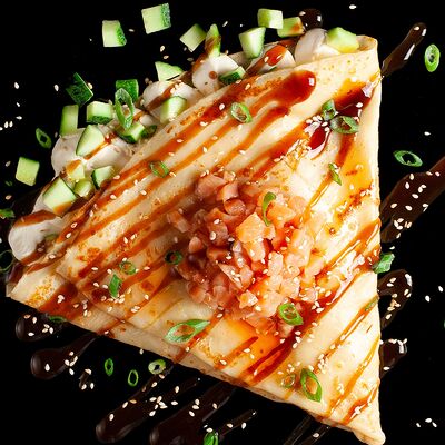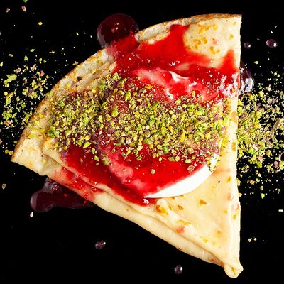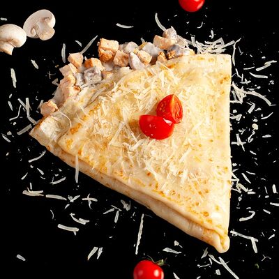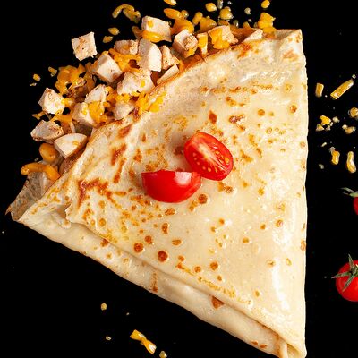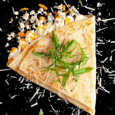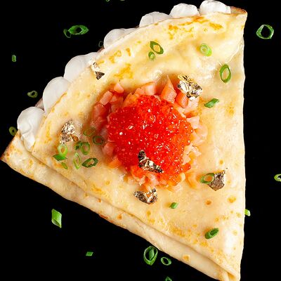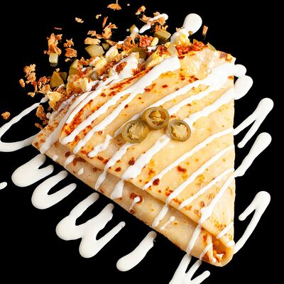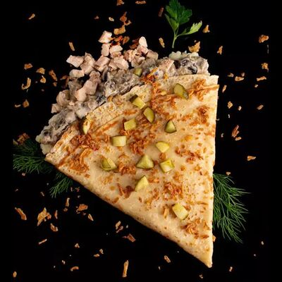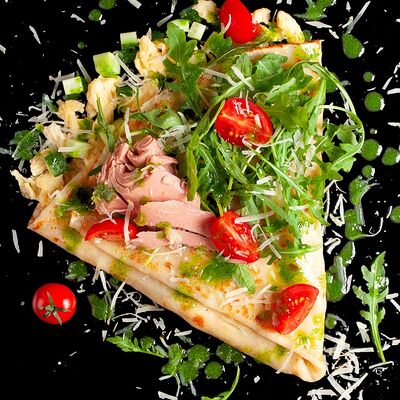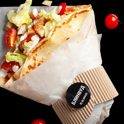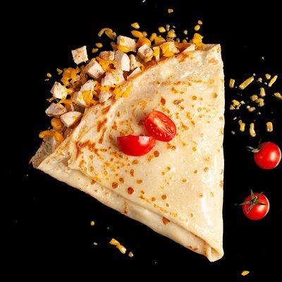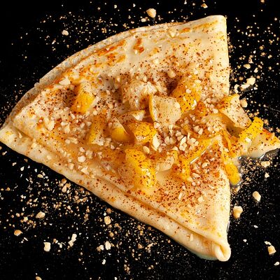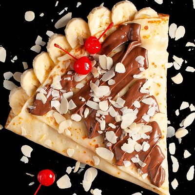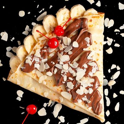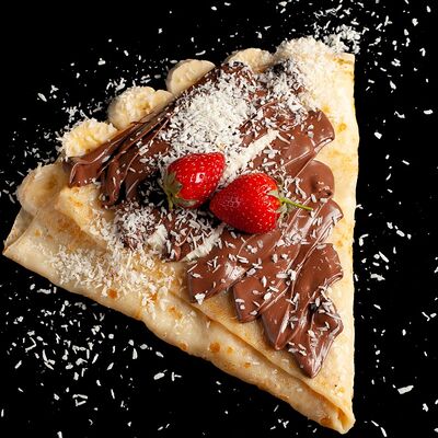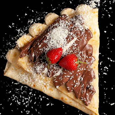 Авторский блин, шоколадная Нутелла, спелый банан, свежие ягоды, сладкий творожный крем-чиз, кокосовая стружка