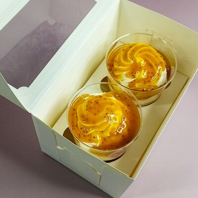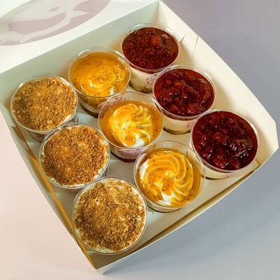 Набор трайфлов: Манго-маракуйя, Малина и Медовик-орех. Бисквит, крем-чиз (творожный сыр, сливки), пюре свежего манго и маракуйи. Малиновый мармелад, ванильный бисквит, бельгийский шоколад и сливки 33%. Сметанно-медовые коржи с добавлением грецкого ореха