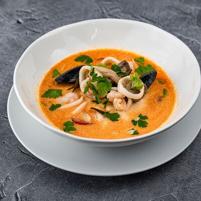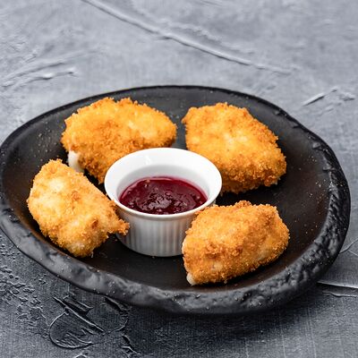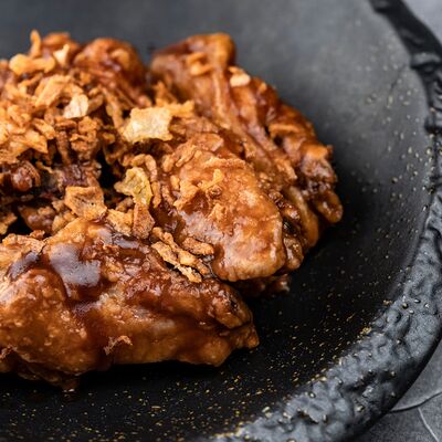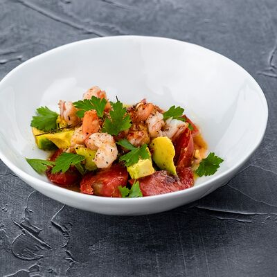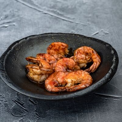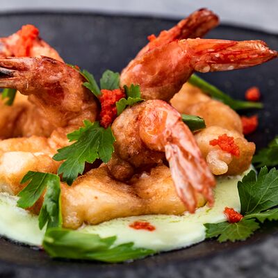 Креветки тигровые, мука, яйцо, шрирача, соус васаби, кинза, тобико