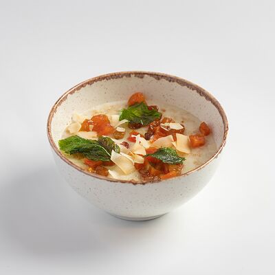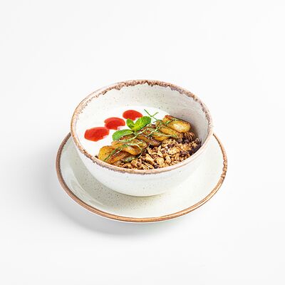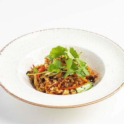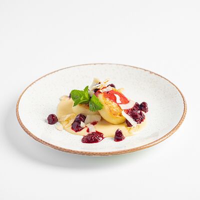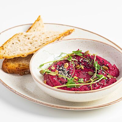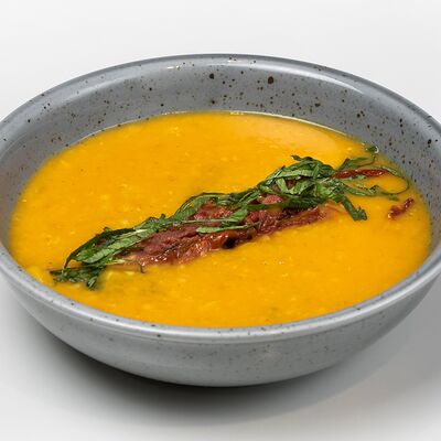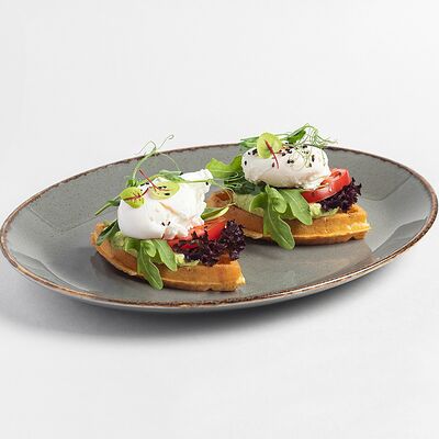 Хрустящая теплая вафля с нежным муссом из сливочного сыра сервируются теплой тыквой, запеченной с чесноком, розмарином и тимьяном, жареным беконом и яйцом пашот