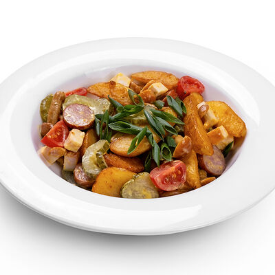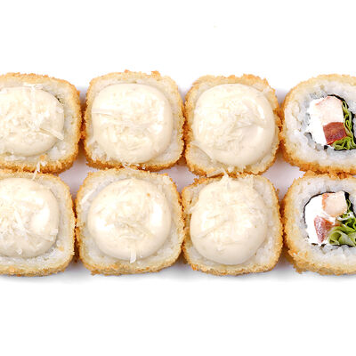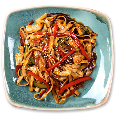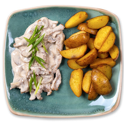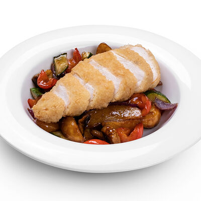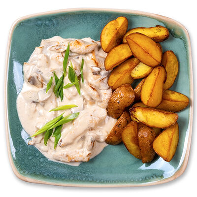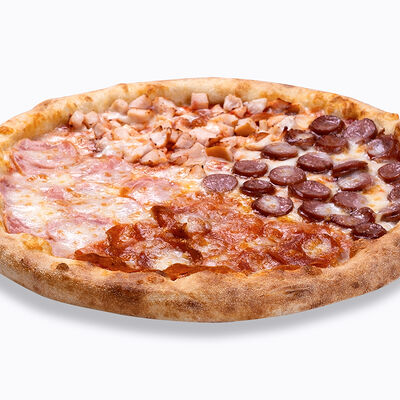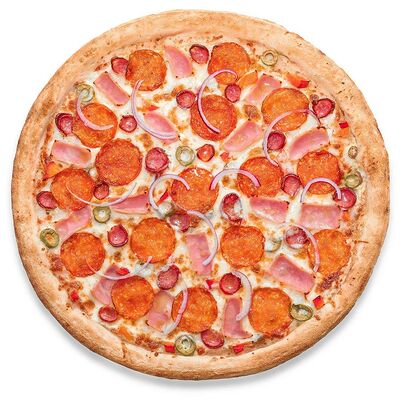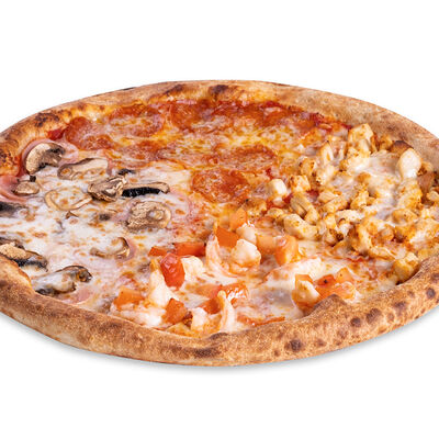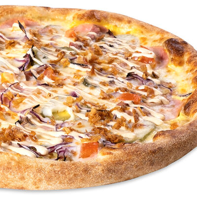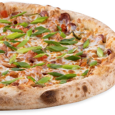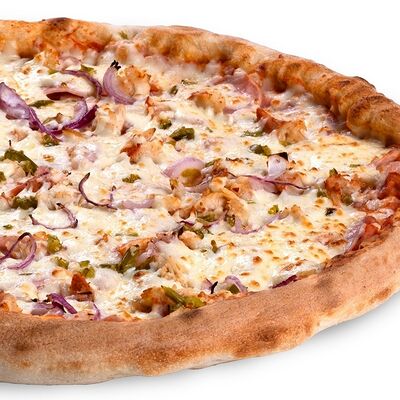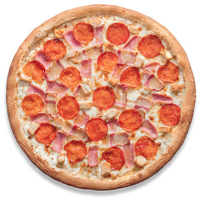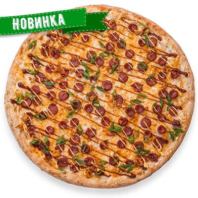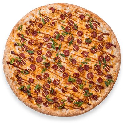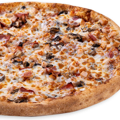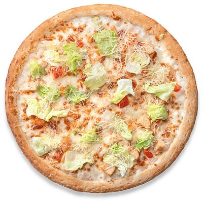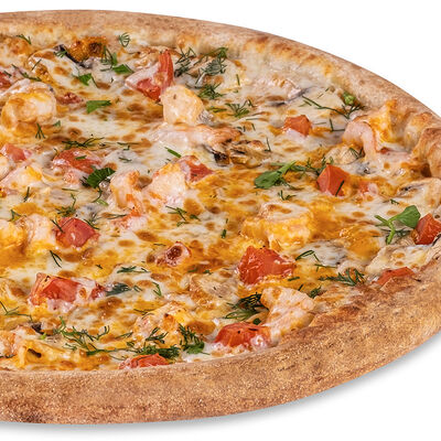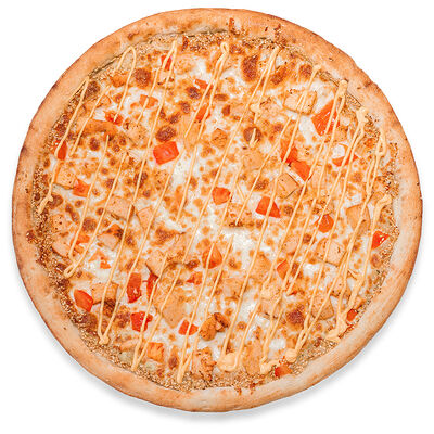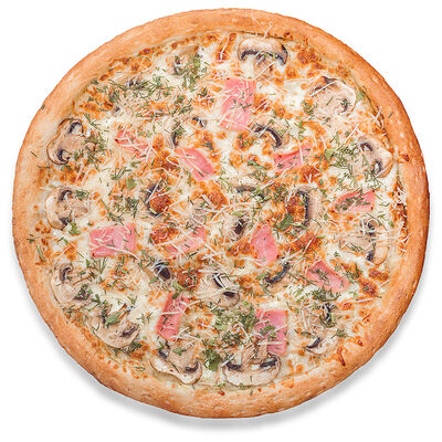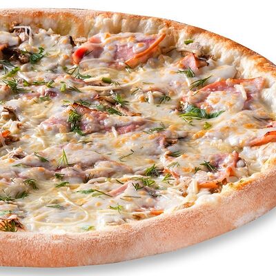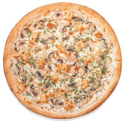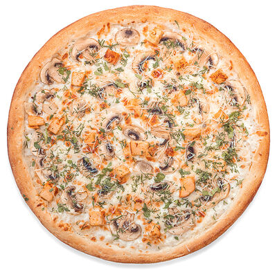 Крафтовое тесто, соус ранч, моцарелла, пармезан, куриная грудка запеченная, шампиньоны, петрушка, укроп