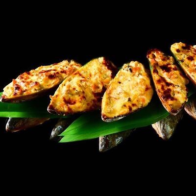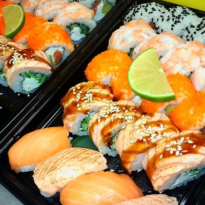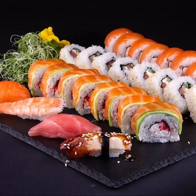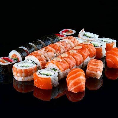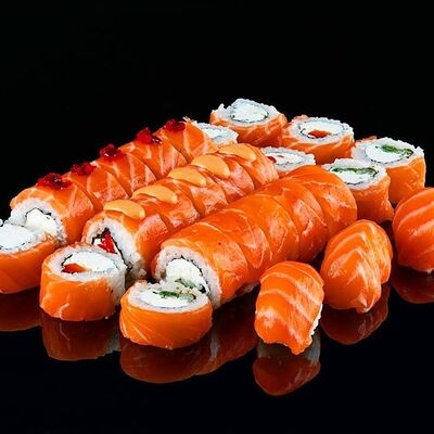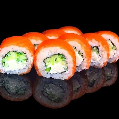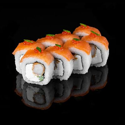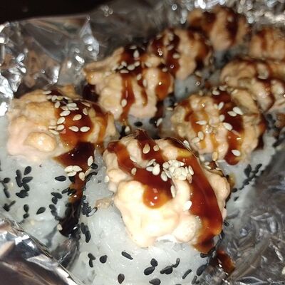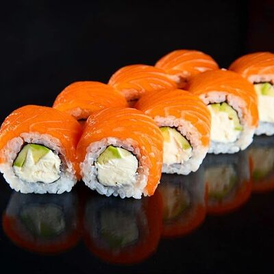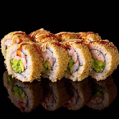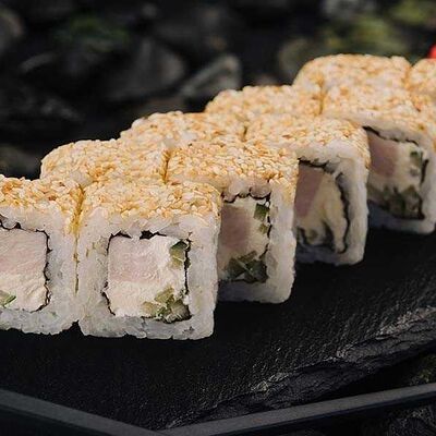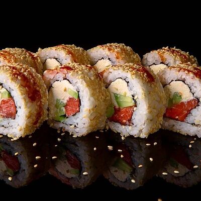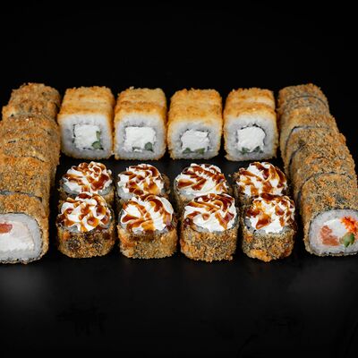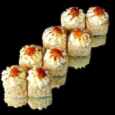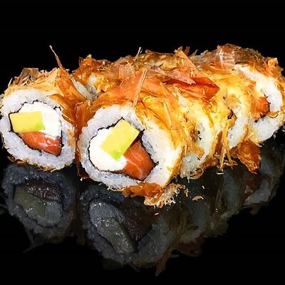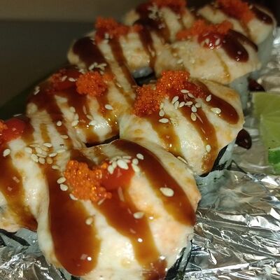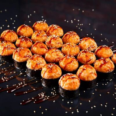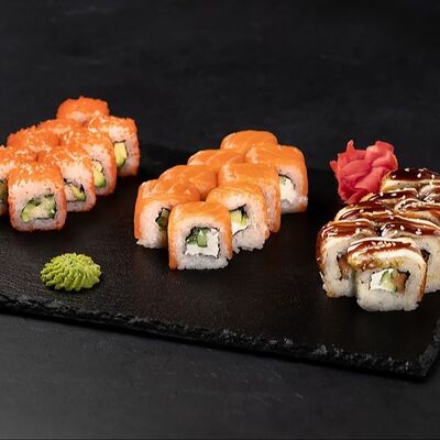Ролл Филадельфия гриль, ролл запечённый Снежный краб, соевый соус, имбирь, васаби