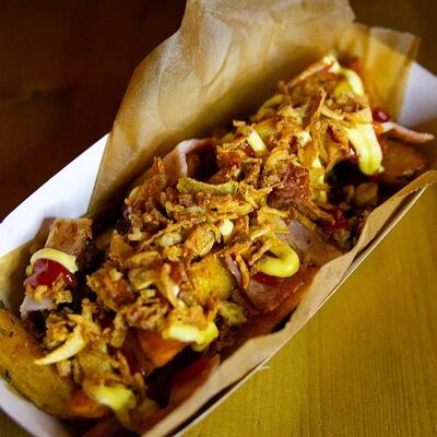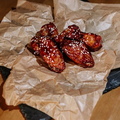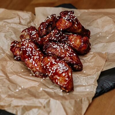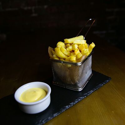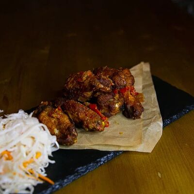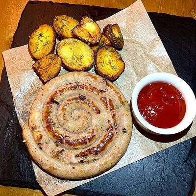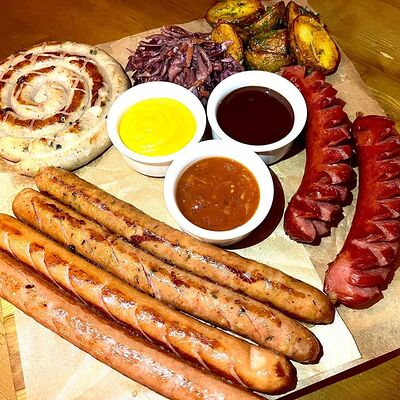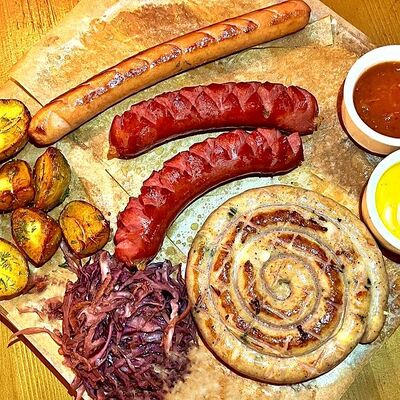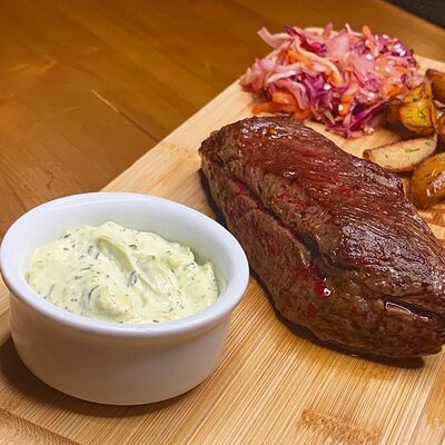 Мраморная говядина, сливочное масло, соль, смесь перцев, острый чесночный соус, Коул Слоу (капуста красная, капуста белокочанная, морковь), бейби картофель