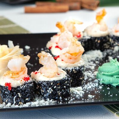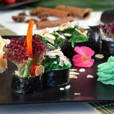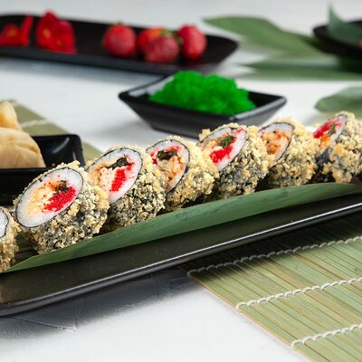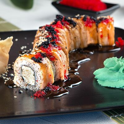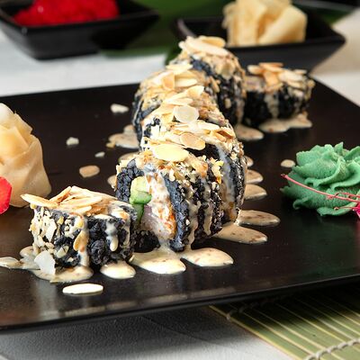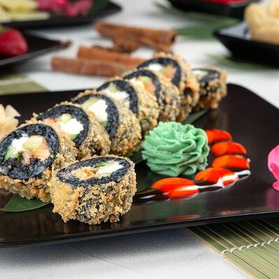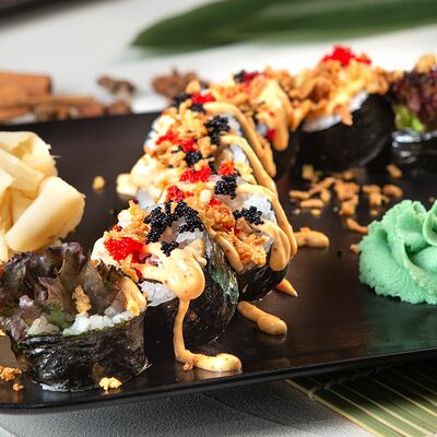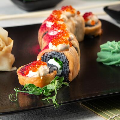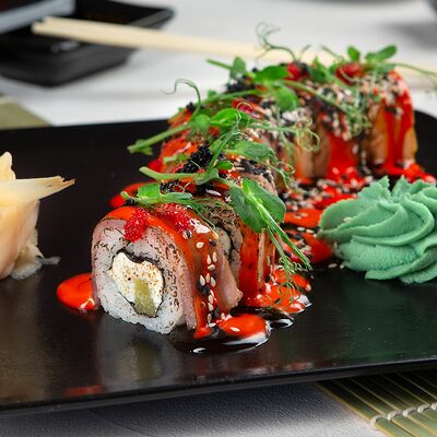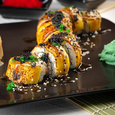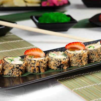 Штрудель из тонкого слоеного теста с начинкой из яблок, орехов и изюма. Подается горячим с карамельным соусом и шариком мороженого