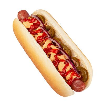 Пшеничная булочка с кунжутом, шарик мраморной говядины, сильно прижатый на гриле, соленый огурец, красный лук, сыр чеддер, кетчуп