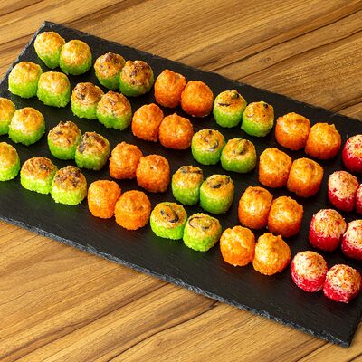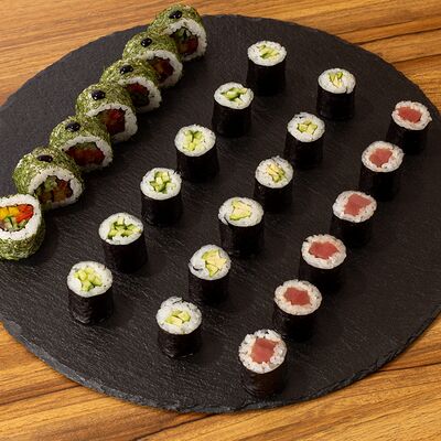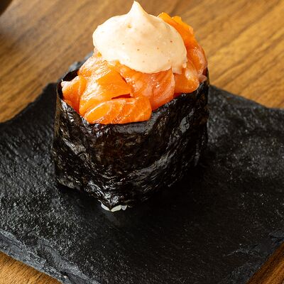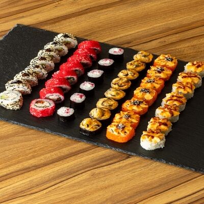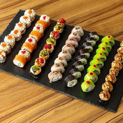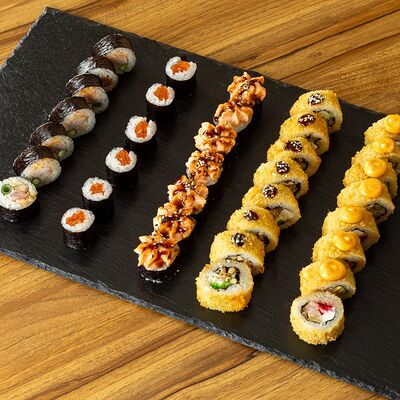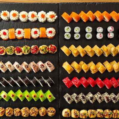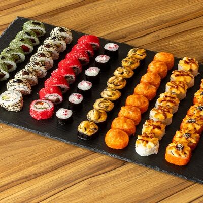 Рис для суши, нори, сыр сливочный, лук зеленый, омлет японский, мидии, спайси-соус