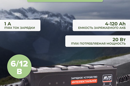 Зарядное устройство AVS BT-1S имеет класс пыле-влагозащищенности IP65 и коннектор для труднодоступных АКБ. Цвет устройства – черный.Напряжение электросети: 220-240В, ~ 50 Гц.Номинальное выходное напряжение: 6/12В постоянного токаНоминальный выходной ток при 6В: 1АНоминальный выходной ток при 12В: 1АМакс. Номинальная потребляемая мощность: 20 ВтЕмкость заряжаемого аккумулятора: 3-120 Ампер-часовЗаряжает аккумуляторы типов: WET - свинцово-кислотный, обслуживаемый; MF - свинцово - кислотный, мало обслуживаемый с доливкой дистиллированной воды; GEL - кислотно-гелиевый, не обслуживаемый; AGM - свинцово-кислотный, не обслуживаемый) Интеллектуальная система заряда* Защита от неправильной полярностиЗащита от перегреваЗащита от перезарядаЗащита от короткого замыканияКласс пыле-влагозащищенности: IP65Коннектор для труднодоступных АКБ * Сложная 5-ти этапная система заряда, как по току, так и по напряжению, включающая режим восстановления АКБ, гарантирует 100% заряд батареи.Предназначено для заряда 6 и 12- вольтовых аккумуляторных батарей автомобилей, мотоциклов, катеров, картов и других транспортных средств.Высокочастотная технология преобразования мощности.