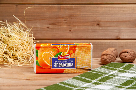 Состав: сахарная пудра, мука пшеничная высшего сорта, жир кондитерский, эмульгатор (лецитин), масло кокосовое, кислота лимонная пищевая, соль поваренная пищевая йодированная, сода пищевая (натрий двууглекислый), ароматизатор натуральный "Апельсиновое масло", крошка этих же вафель.