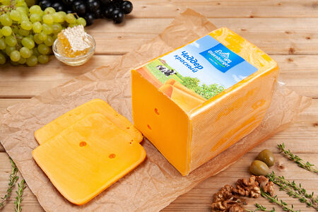 Состав: молоко нормализованное пастеризованное, соль пищевая, закваска мезофильных микроорганизмов, натуральный молокосвёртывающий ферментный препарат животного происхождения, с использованием комплексной пищевой добавки - кальций хлористый жидкий (хлорид кальция Е509, вода), красителя - аннато), ферментного препарата животного происхождения - лизоцим. Пищевая ценность на 100 гр. продукта: белок - 23,0 г.; жир - 25,0 г. Энергетическая ценность: 315,0 ккал/1320,0 кДж Срок годности: 210 суток при температуре от -4°С до +4°С и относительной влажности воздуха 80-90%.