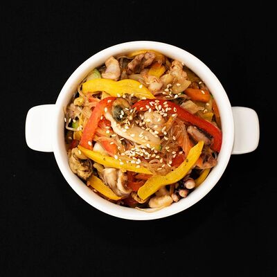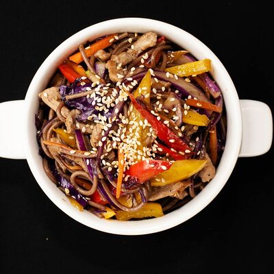 Гречневая лапша, овощи вок, соевый соус, перечный, капуста краснокочанная