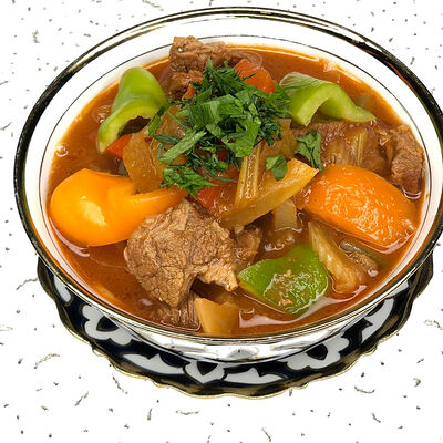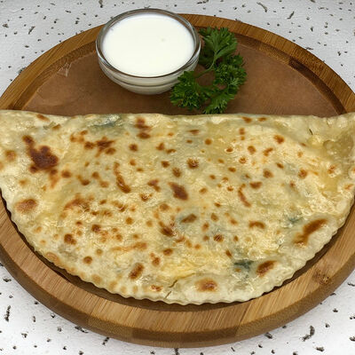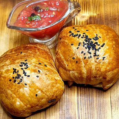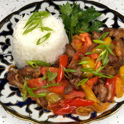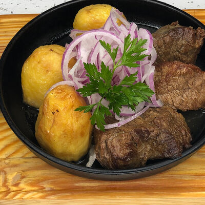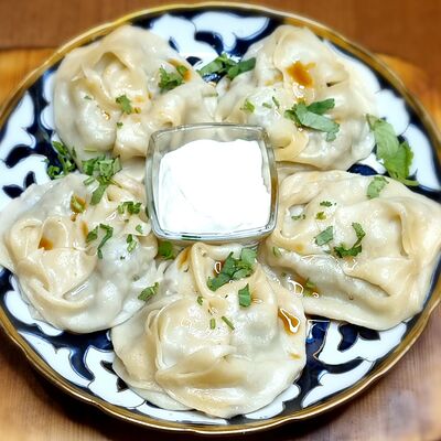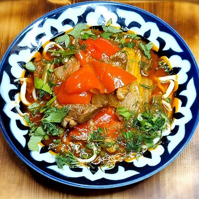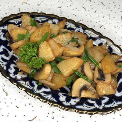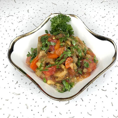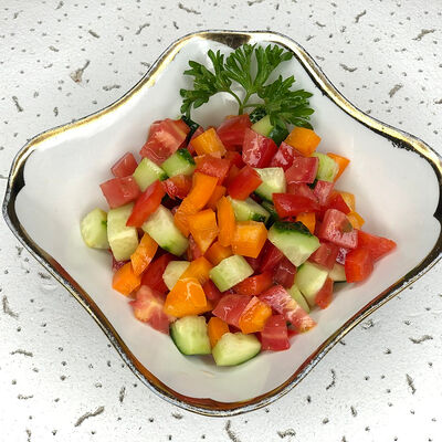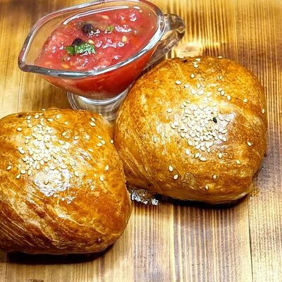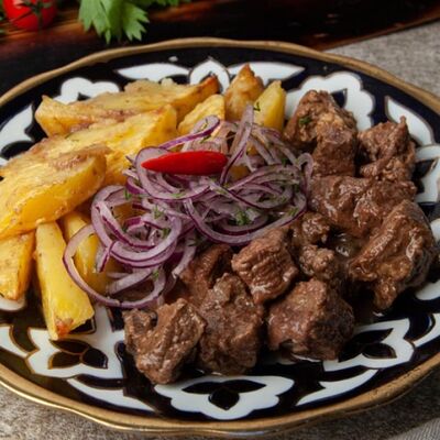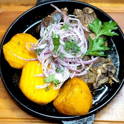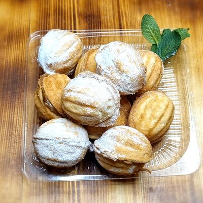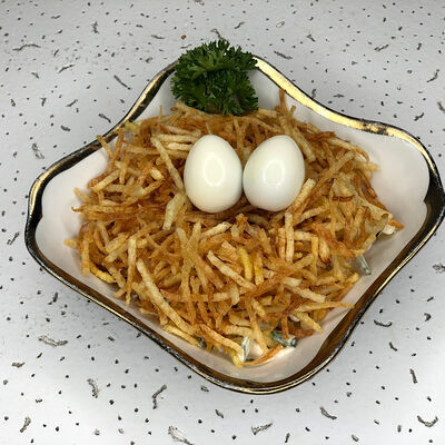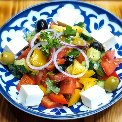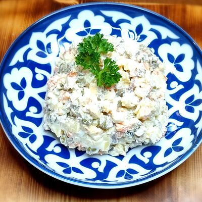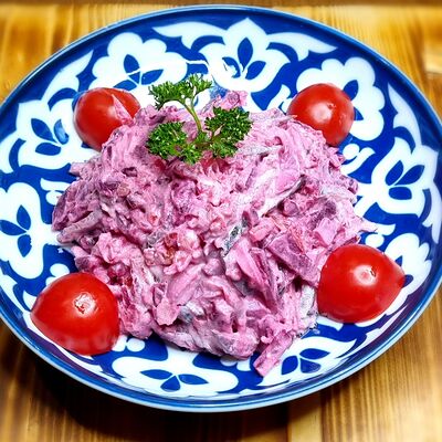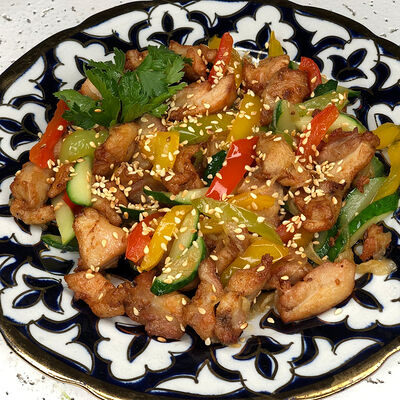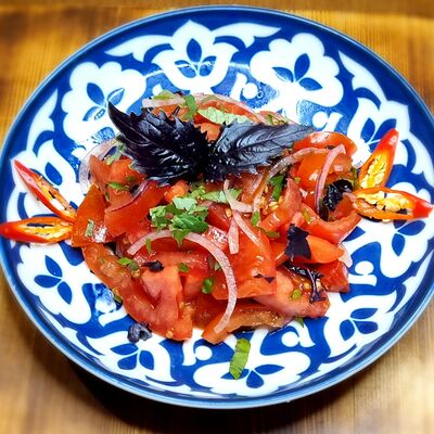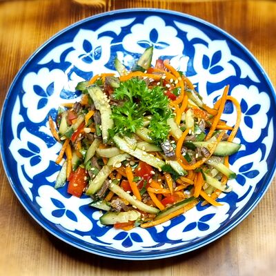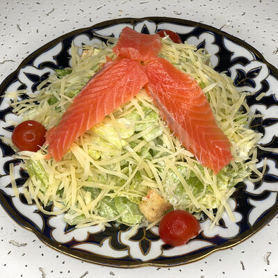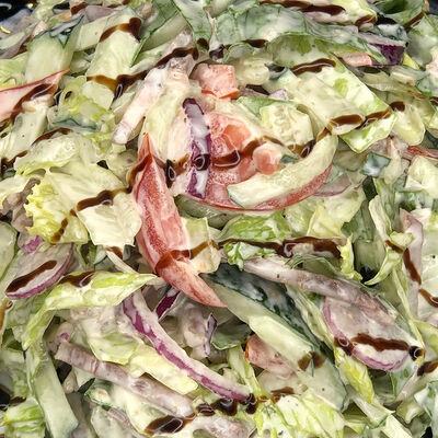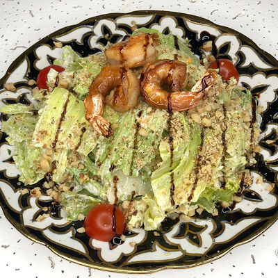 Креветки, салат айсберг, помидорчики черри, грецкий орех и луковые чипсы. Заправляется пикантным соусом