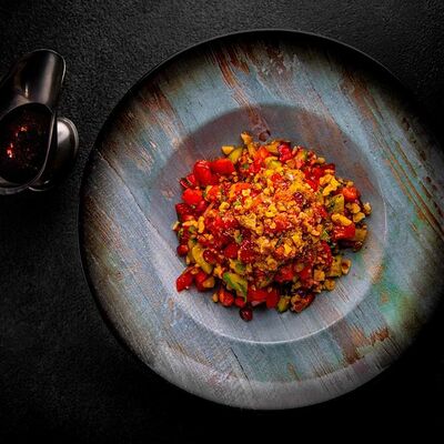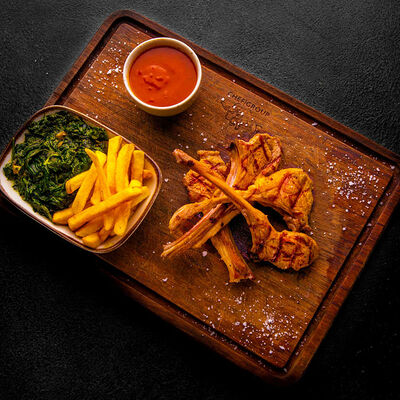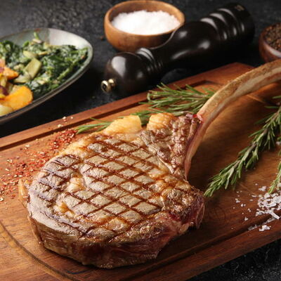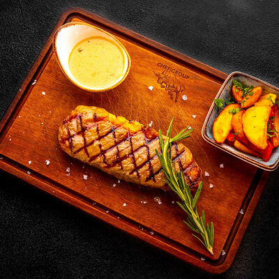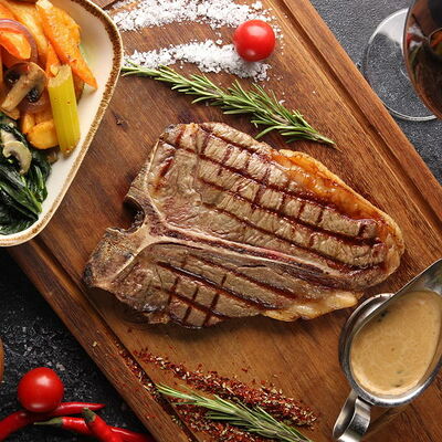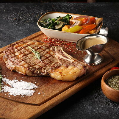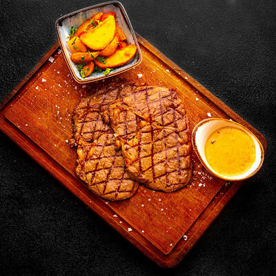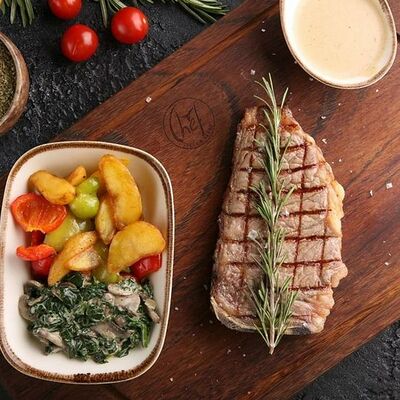 Стейк Рибай на кости, картофель по-деревенски с овощами, соус